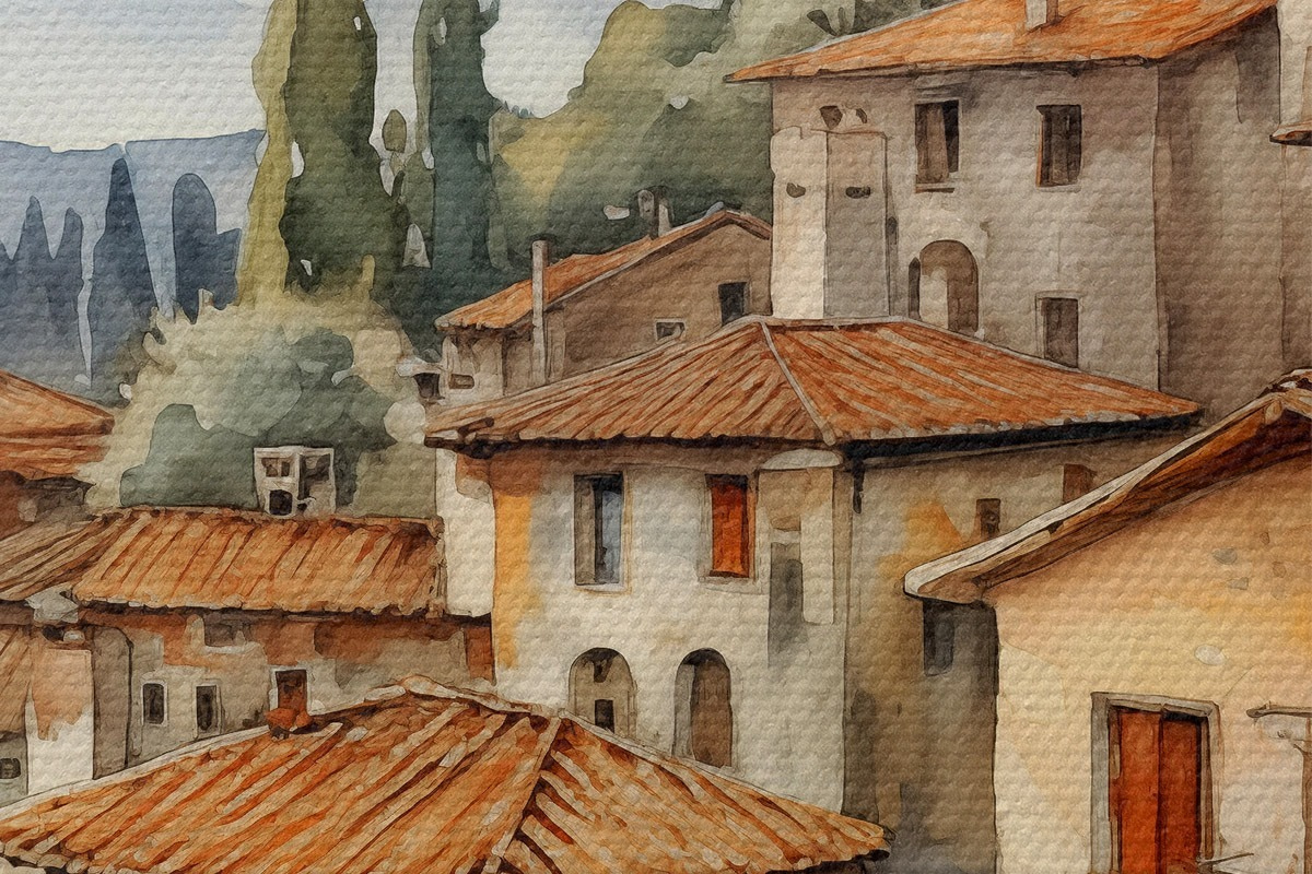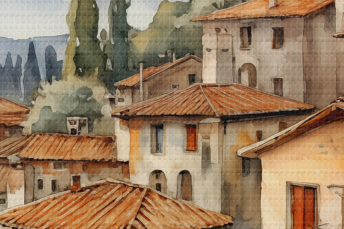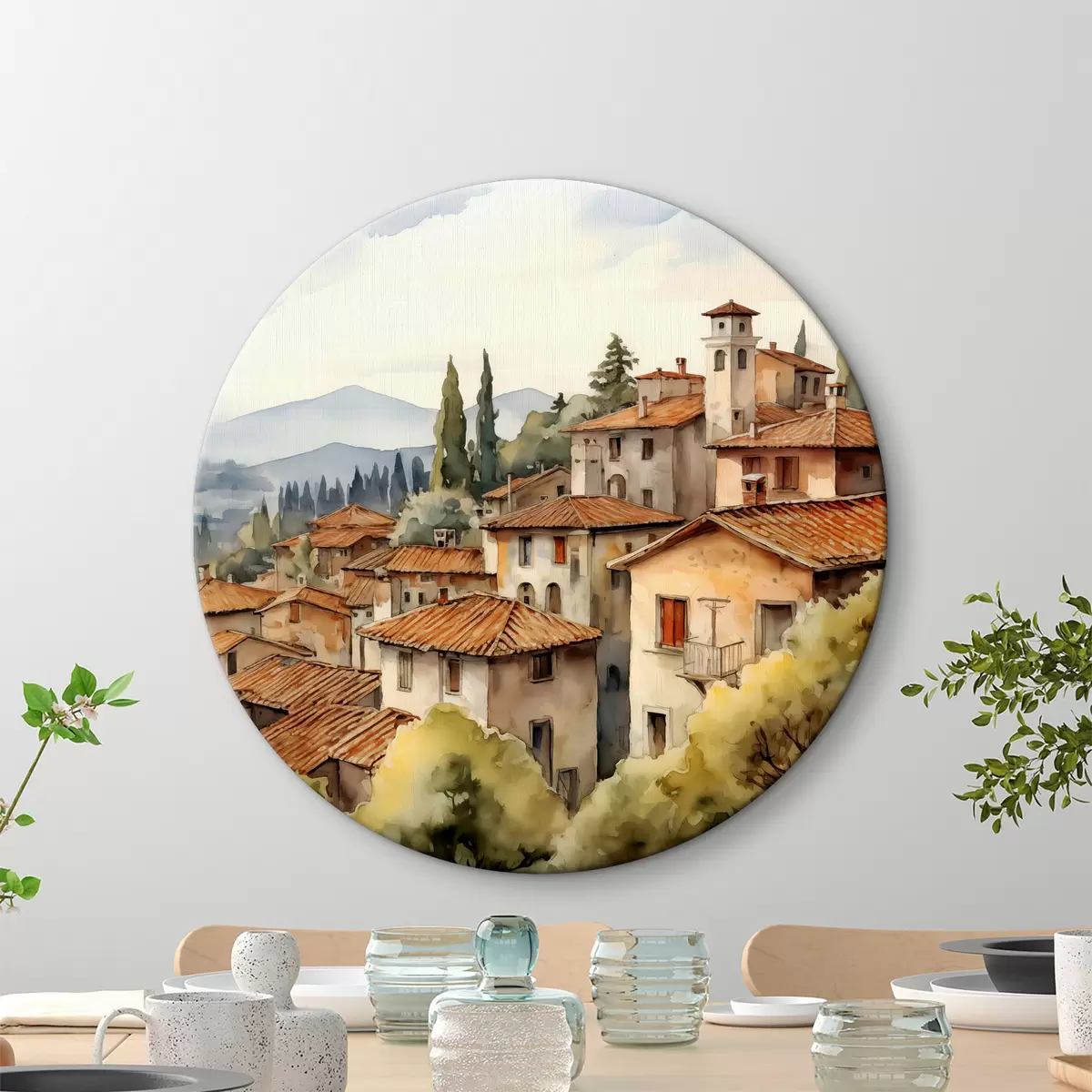 Runde Wandbilder Häuser in italienischen Dörfern vor der Kulisse von Bergen, Dächern, Aquarell r39934