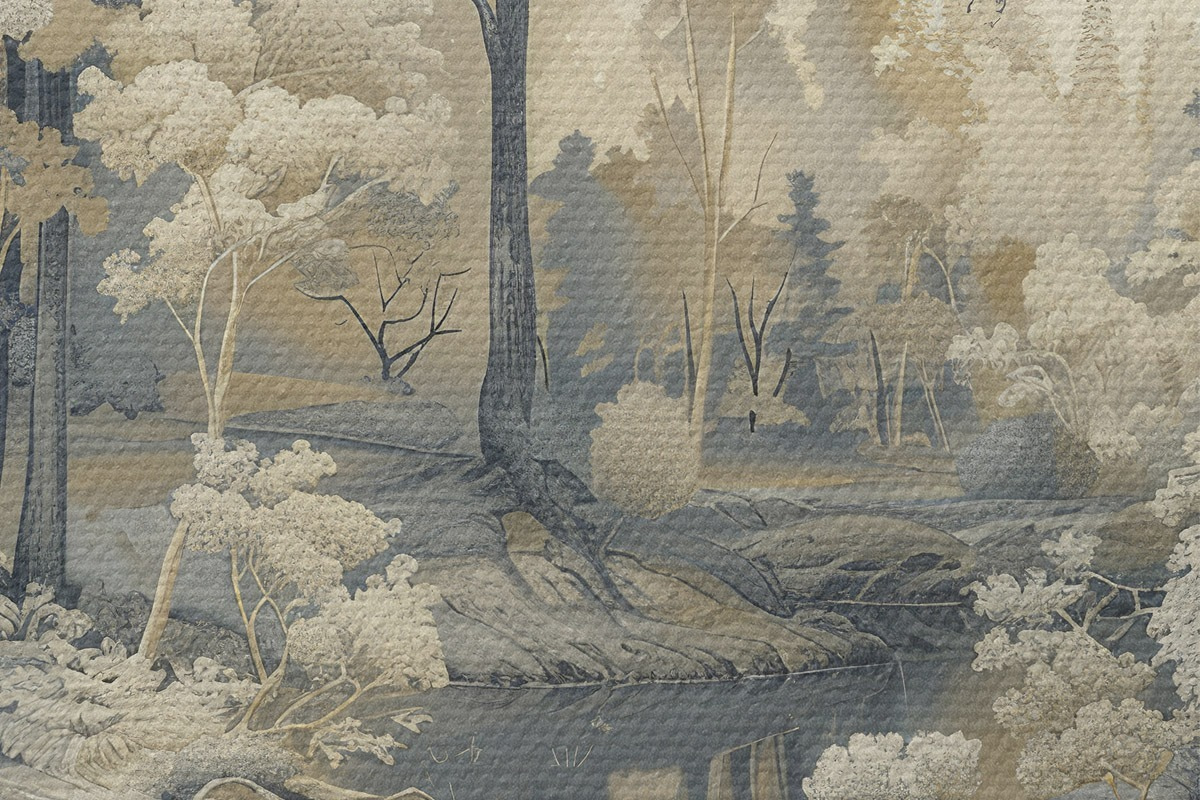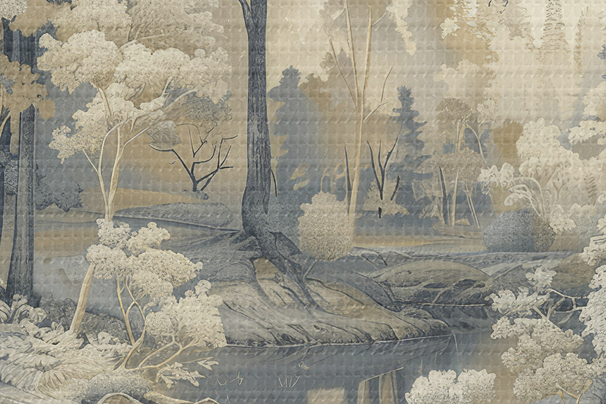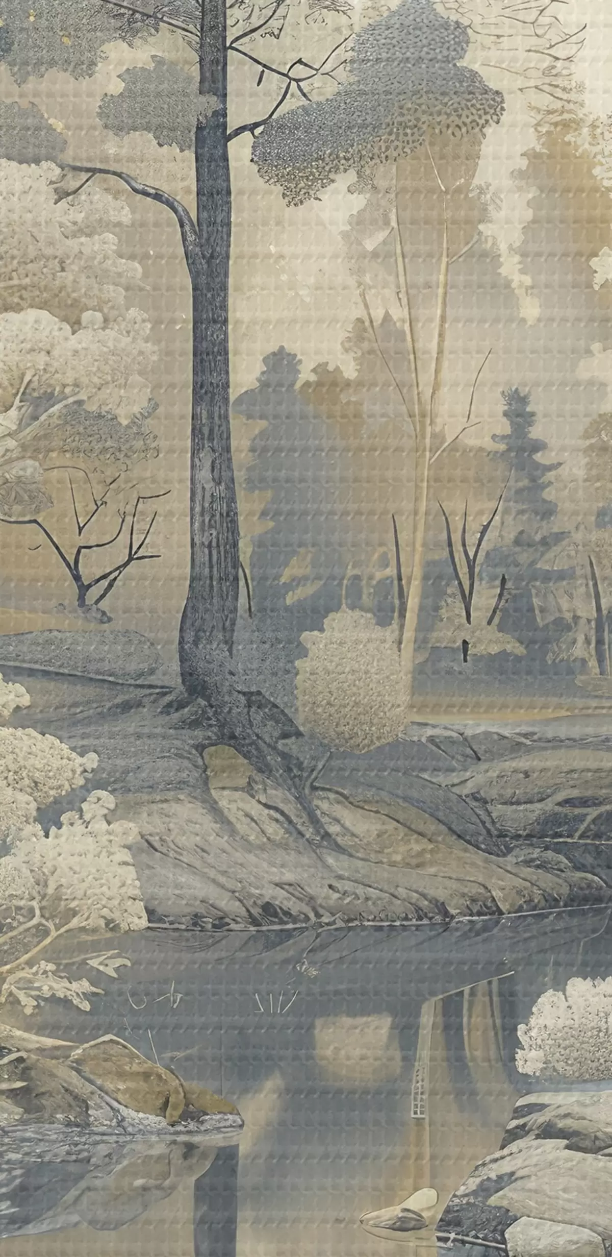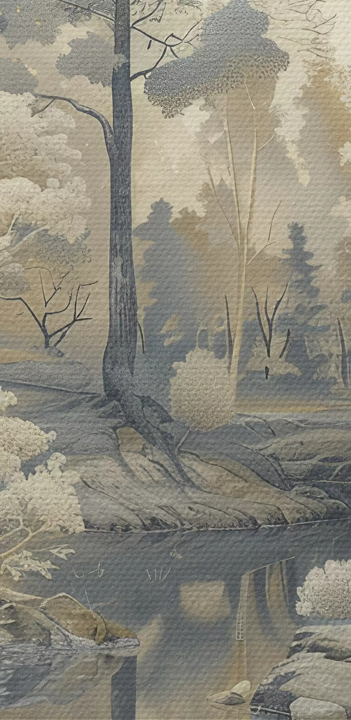 Runde Wandbilder Waldlandschaft, monochrome Farben, Bäume, Teich, sanfte Pastellfarben r39974