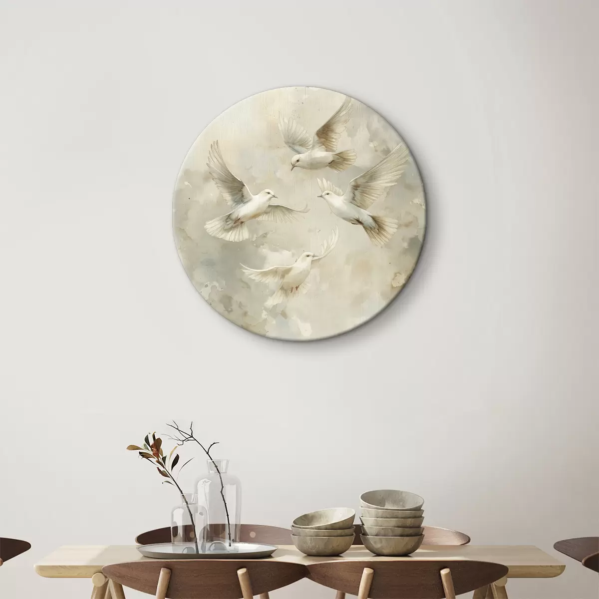 Runde Wandbilder Aquarell fliegende Vögel, sanfte Beige- und Weißtöne, Tauben Nr r39976