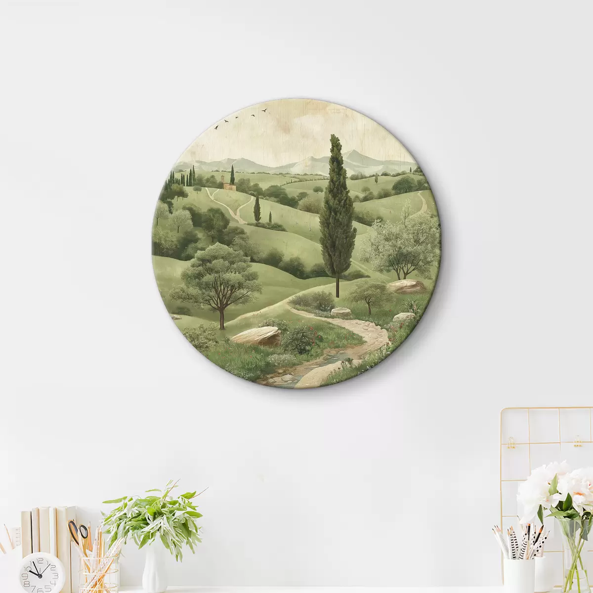 Runde Wandbilder Toskanische Landschaft, Vintage-Stil, pastellgrüne Farben, Hügel und Bäume Nr r40075