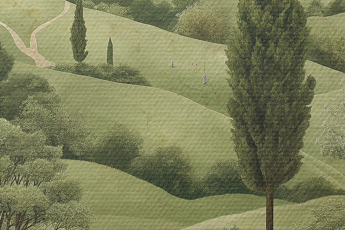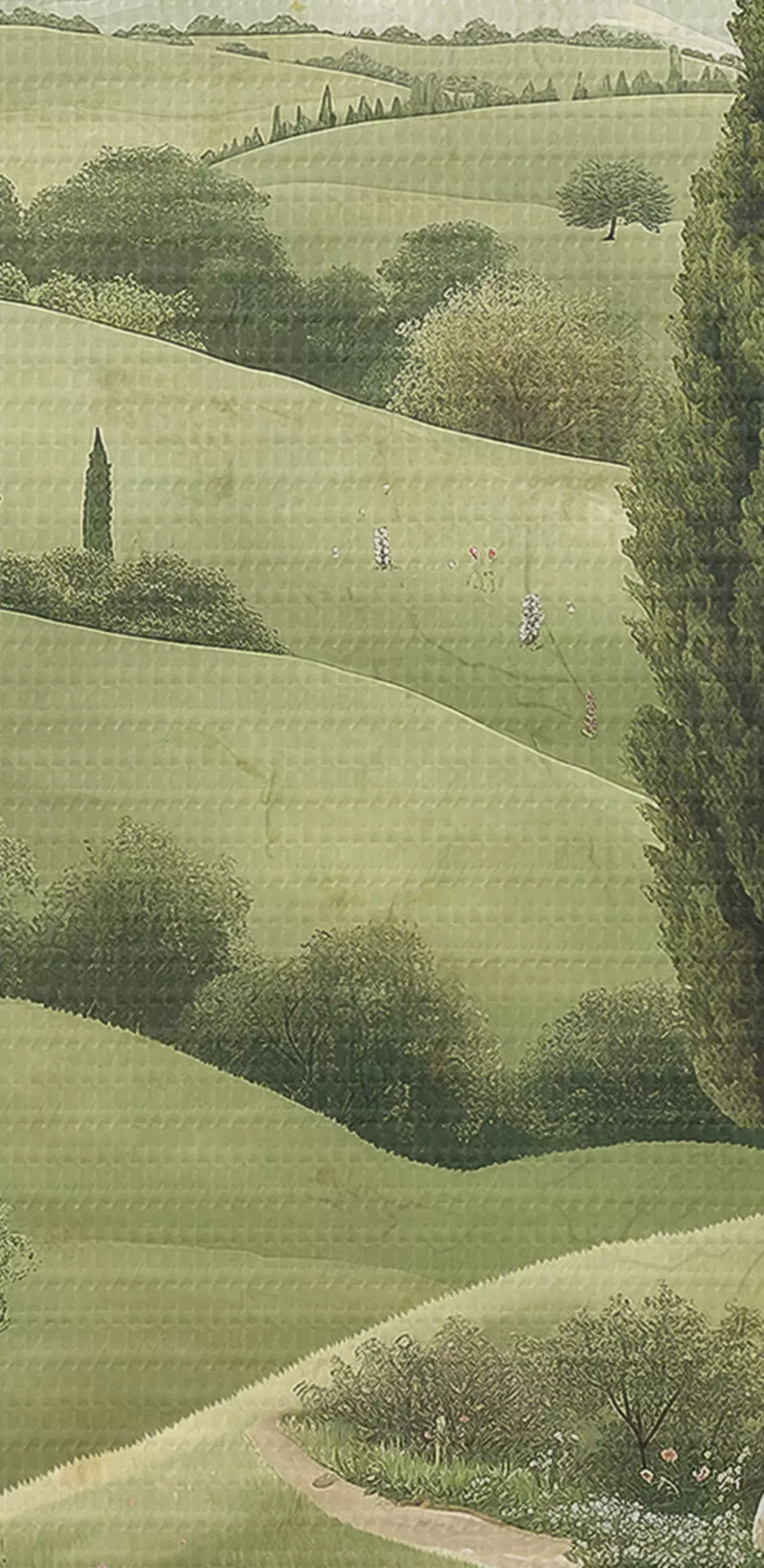 Runde Wandbilder Toskanische Landschaft, Vintage-Stil, pastellgrüne Farben, Hügel und Bäume r40075