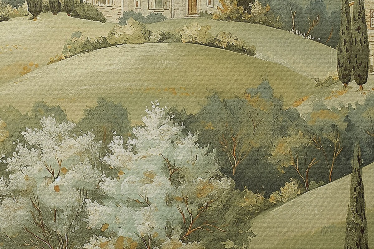 Runde Wandbilder Landschaft mit Vintage-Häusern, pastellgrüne Farben, Acrylzeichnung, Sommer r40078