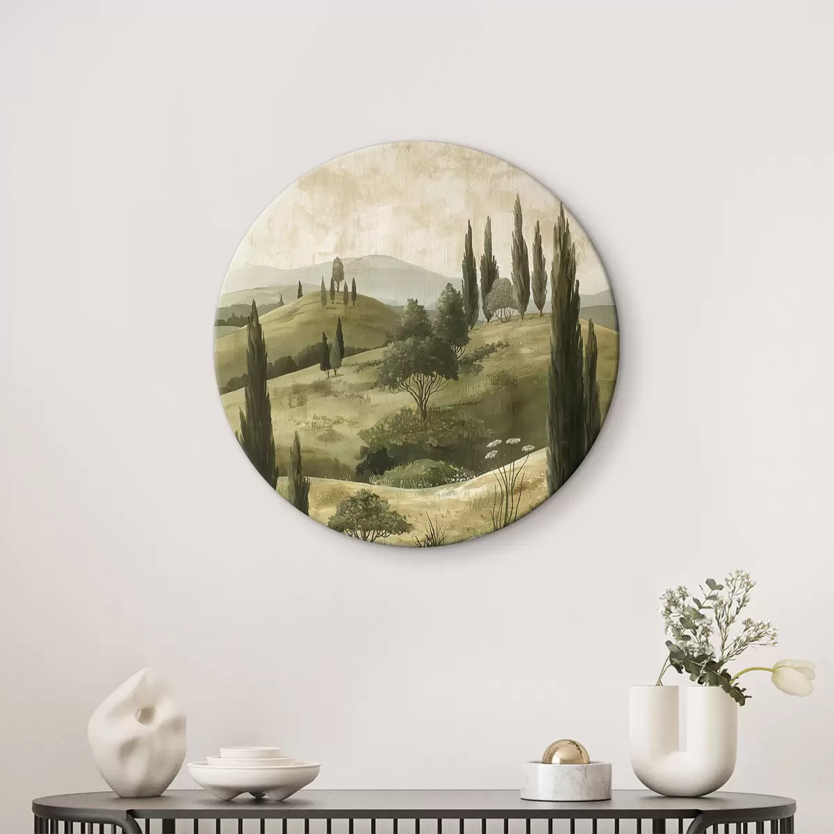 Runde Wandbilder Vintage-Landschaft, rustikaler Stil, Pastellfarben, Wiese mit Blumen und Bäumen r40081