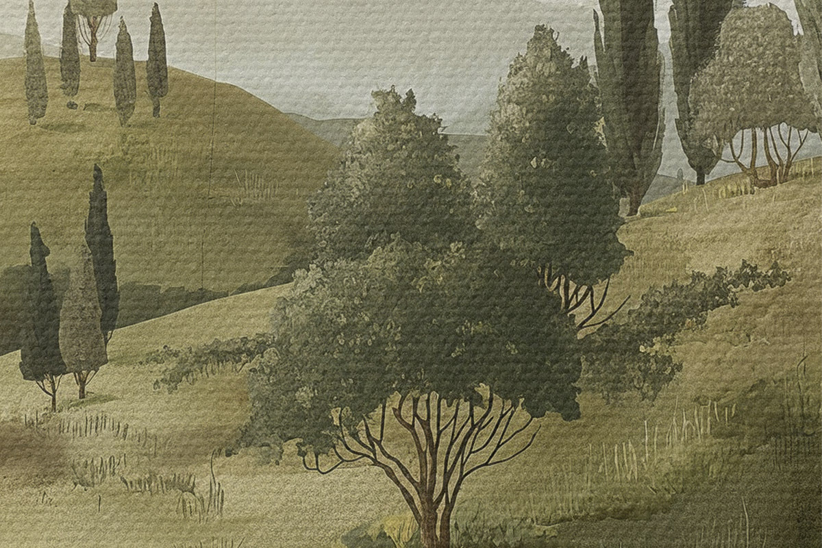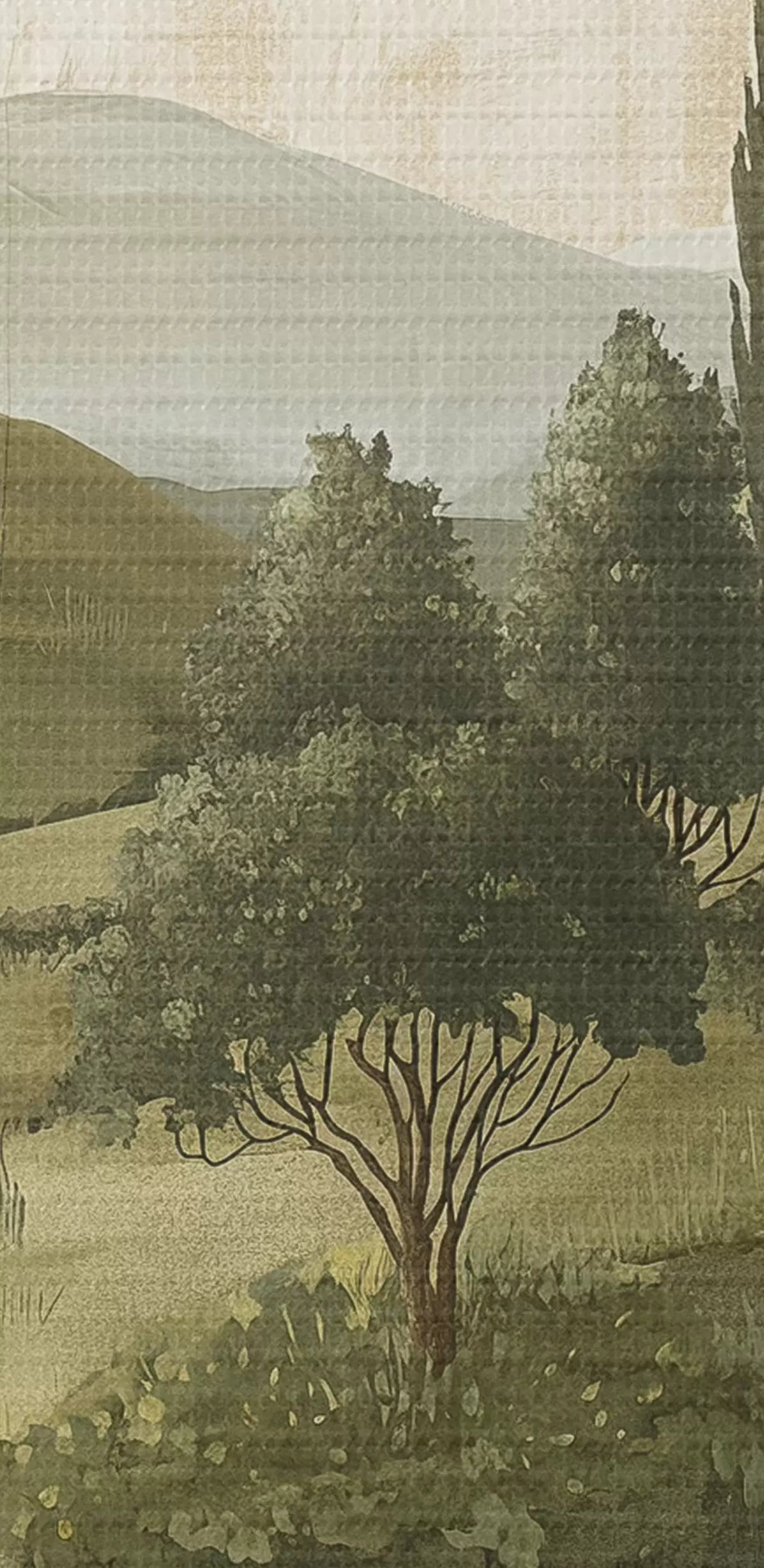 Runde Wandbilder Vintage-Landschaft, rustikaler Stil, Pastellfarben, Wiese mit Blumen und Bäumen Nr r40081