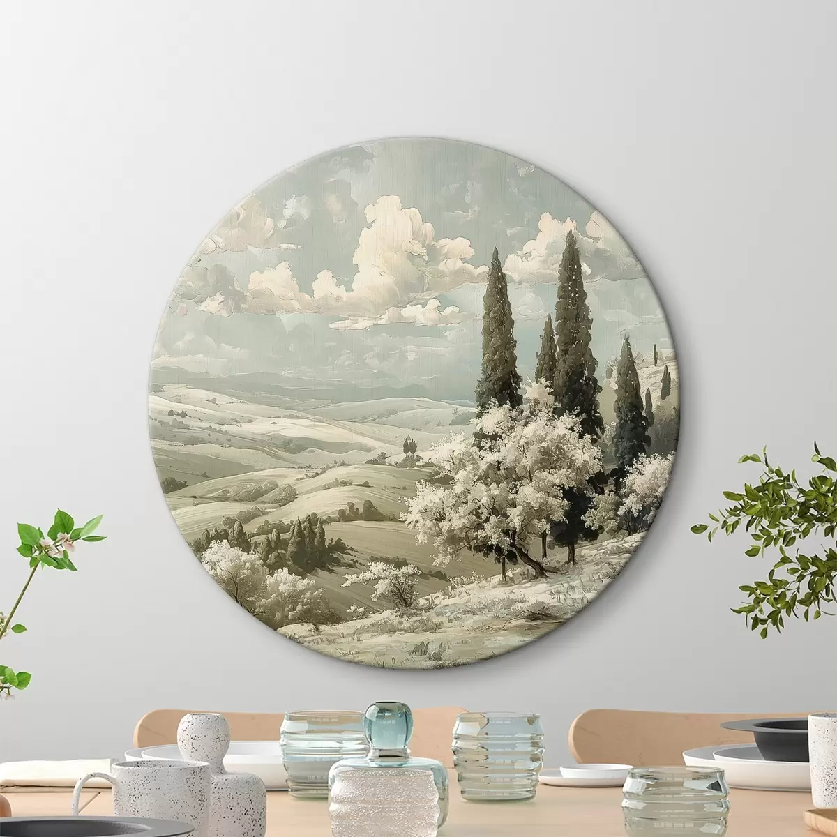 Runde Wandbilder Sommerlandschaft, Vintage-Stil, Pastellfarben, Acrylzeichnung, Schloss r40084