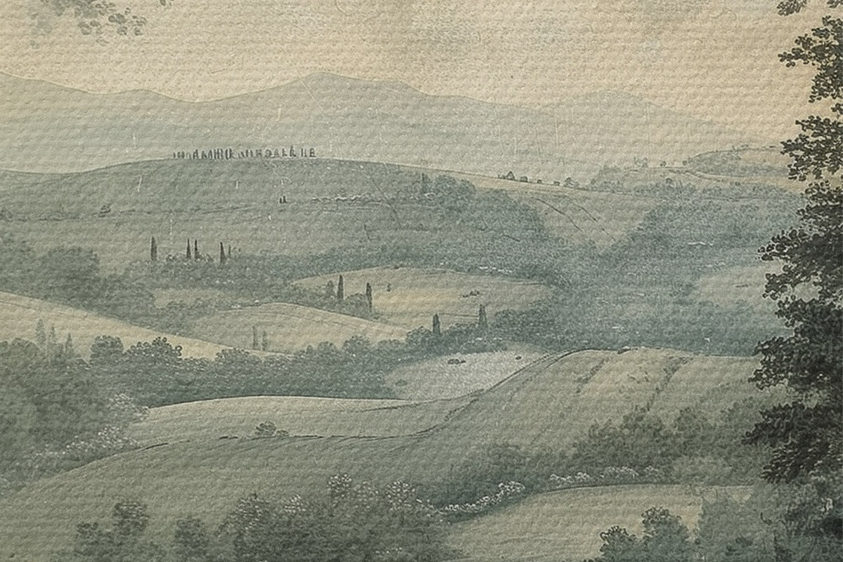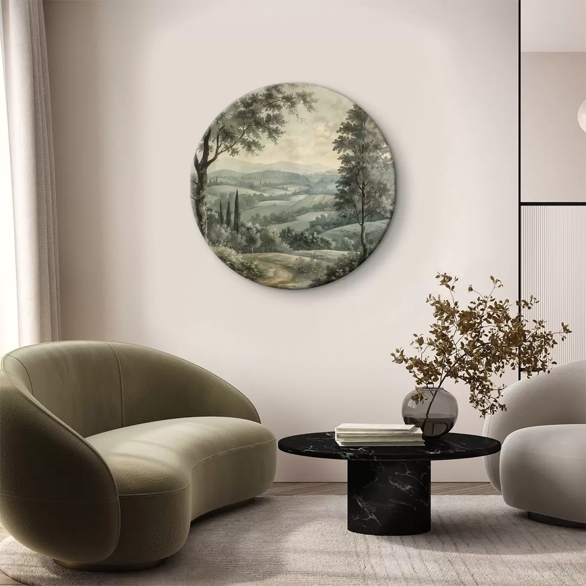 Runde Wandbilder Vintage italienische Landschaft, rustikaler Stil, Pastellfarben, Hügel mit Bäumen, Boho r40086