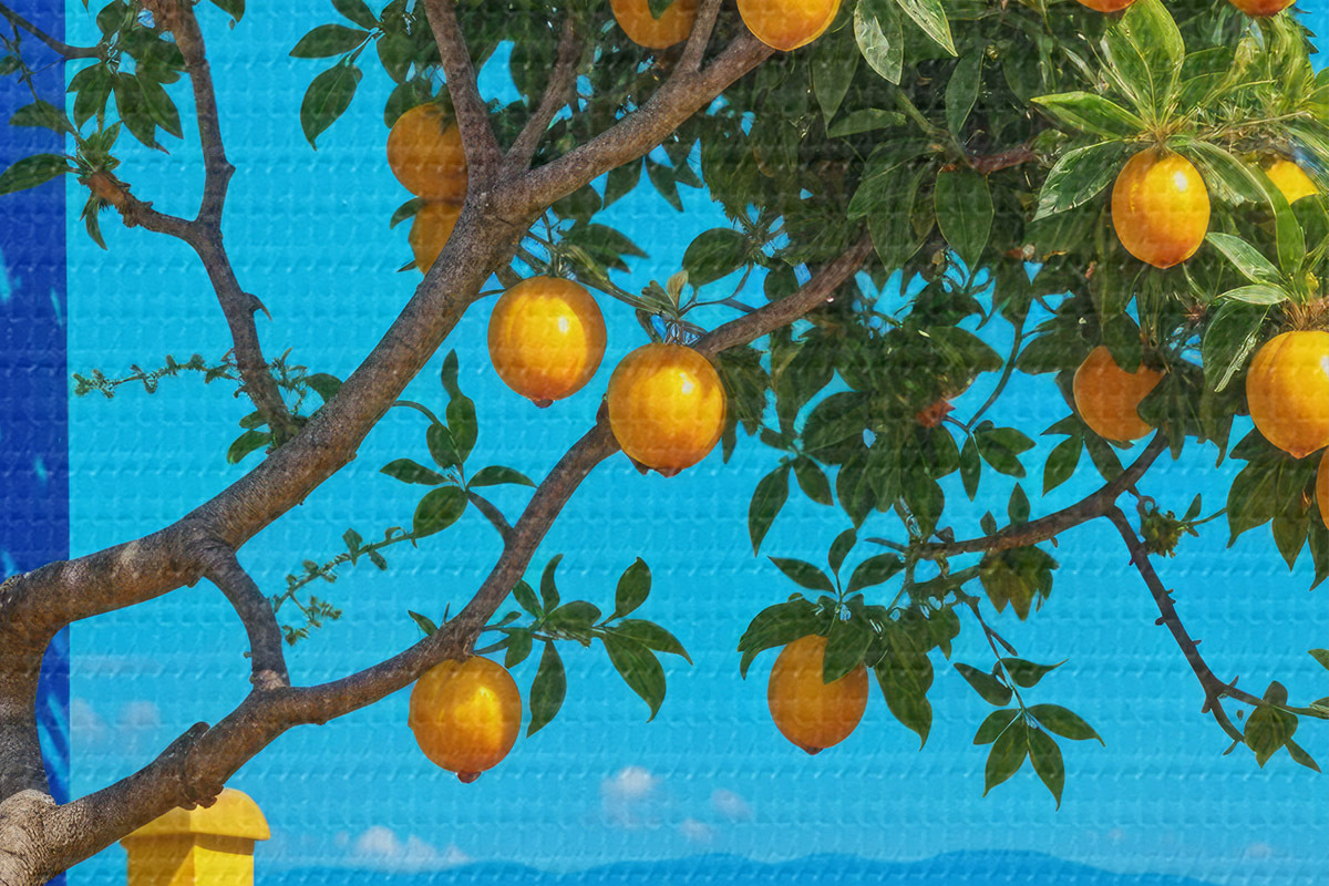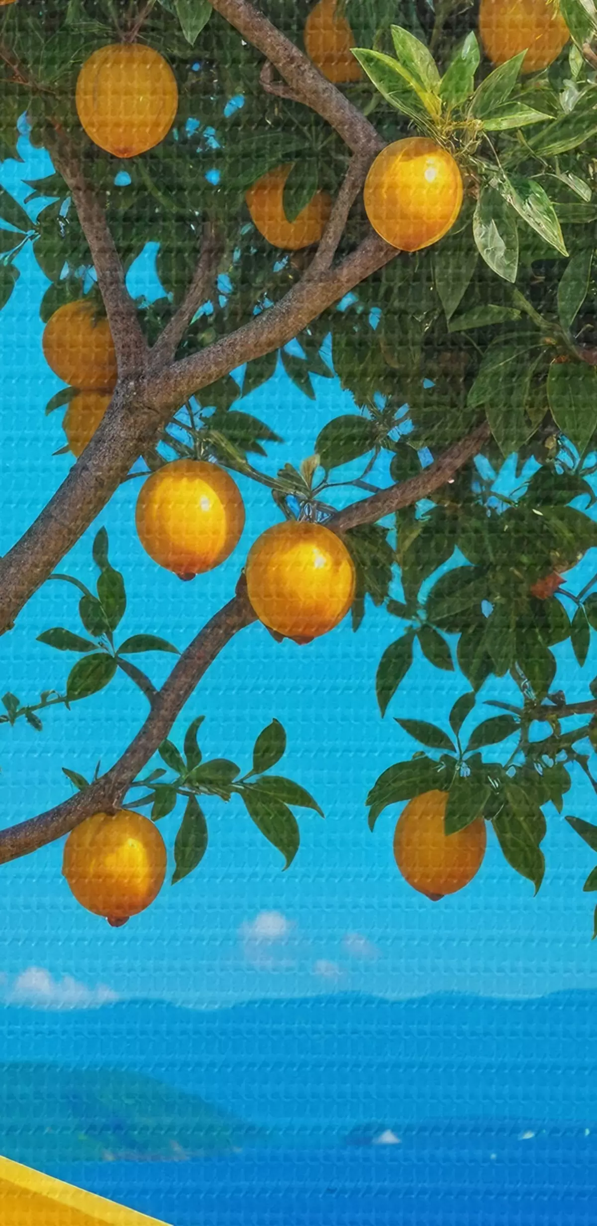 Runde Wandbilder Ein Orangenbaum mit reifen Früchten wächst auf einem Gebäude mit blauer Wand und Ziegeldach mit Blick auf den Ozean Nr r40159