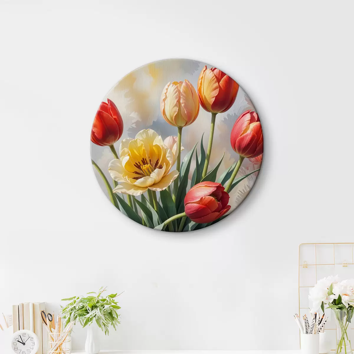 Runde Wandbilder Bunte Tulpen in verschiedenen Rot-, Orange- und Gelbtönen vor hellem Hintergrund r40167