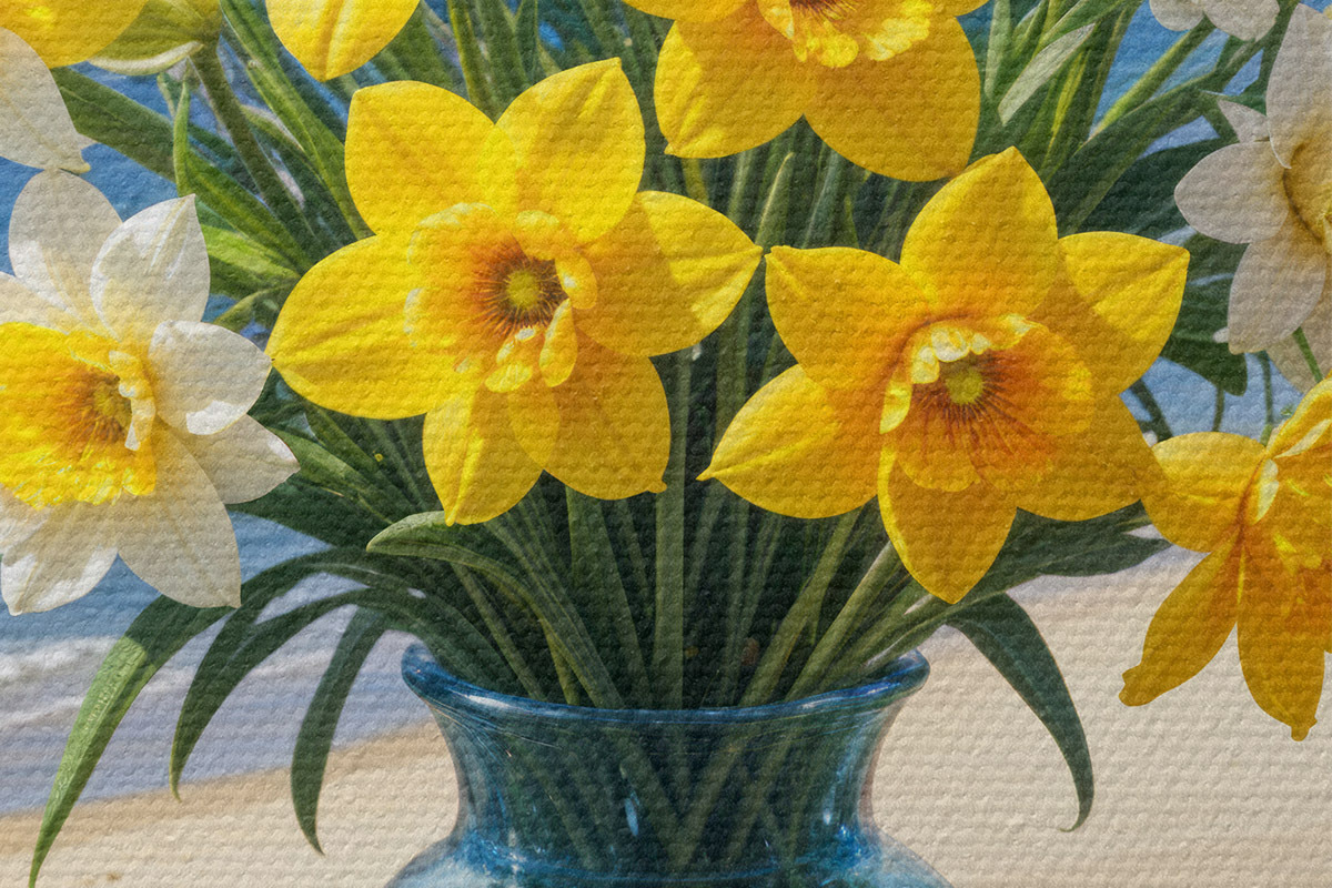 Runde Wandbilder Ein Strauß gelber Narzissen und weißer Gänseblümchen in einer Glasvase auf einer Fensterbank mit Blick auf Strand und Meer r40171