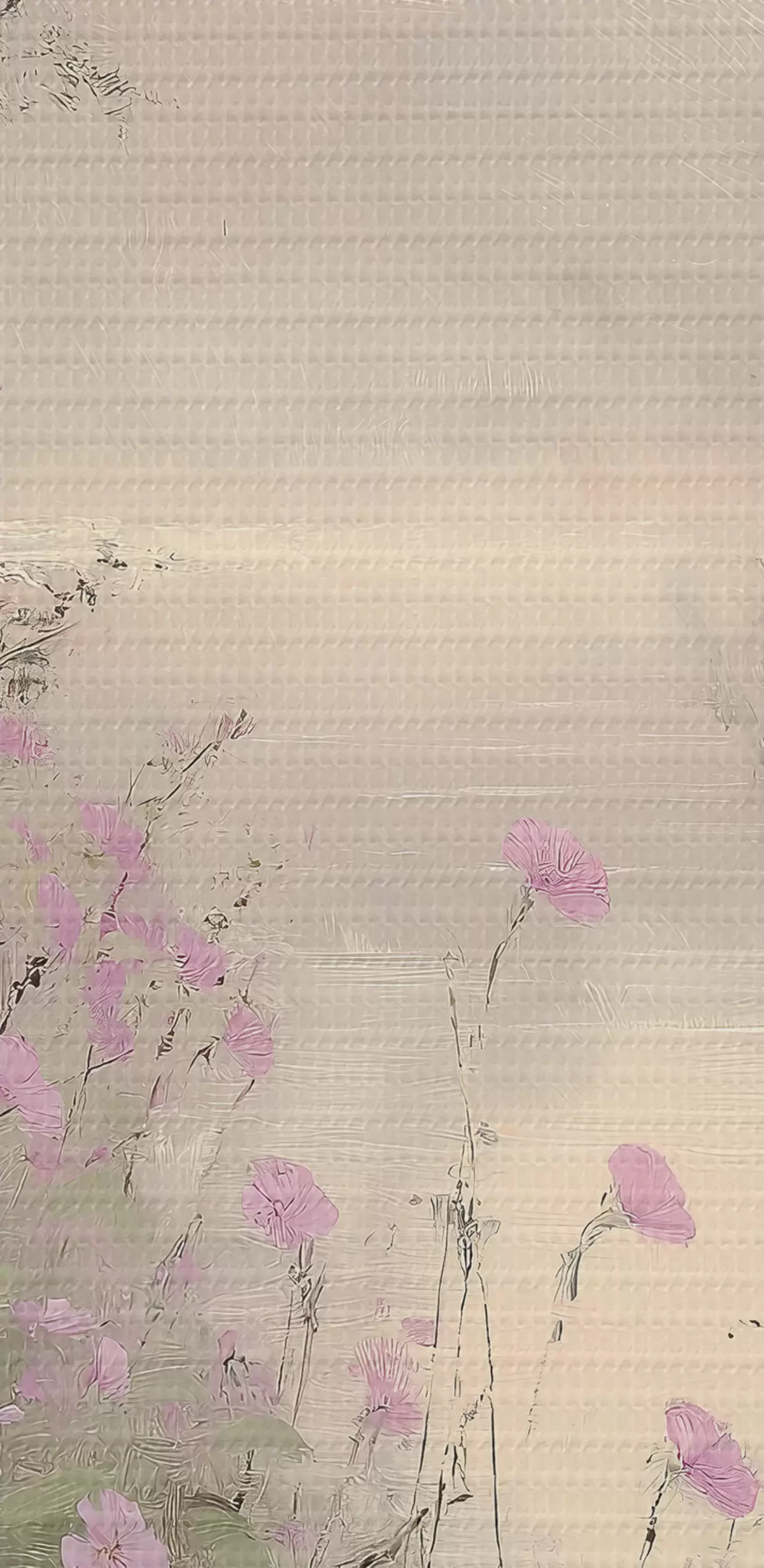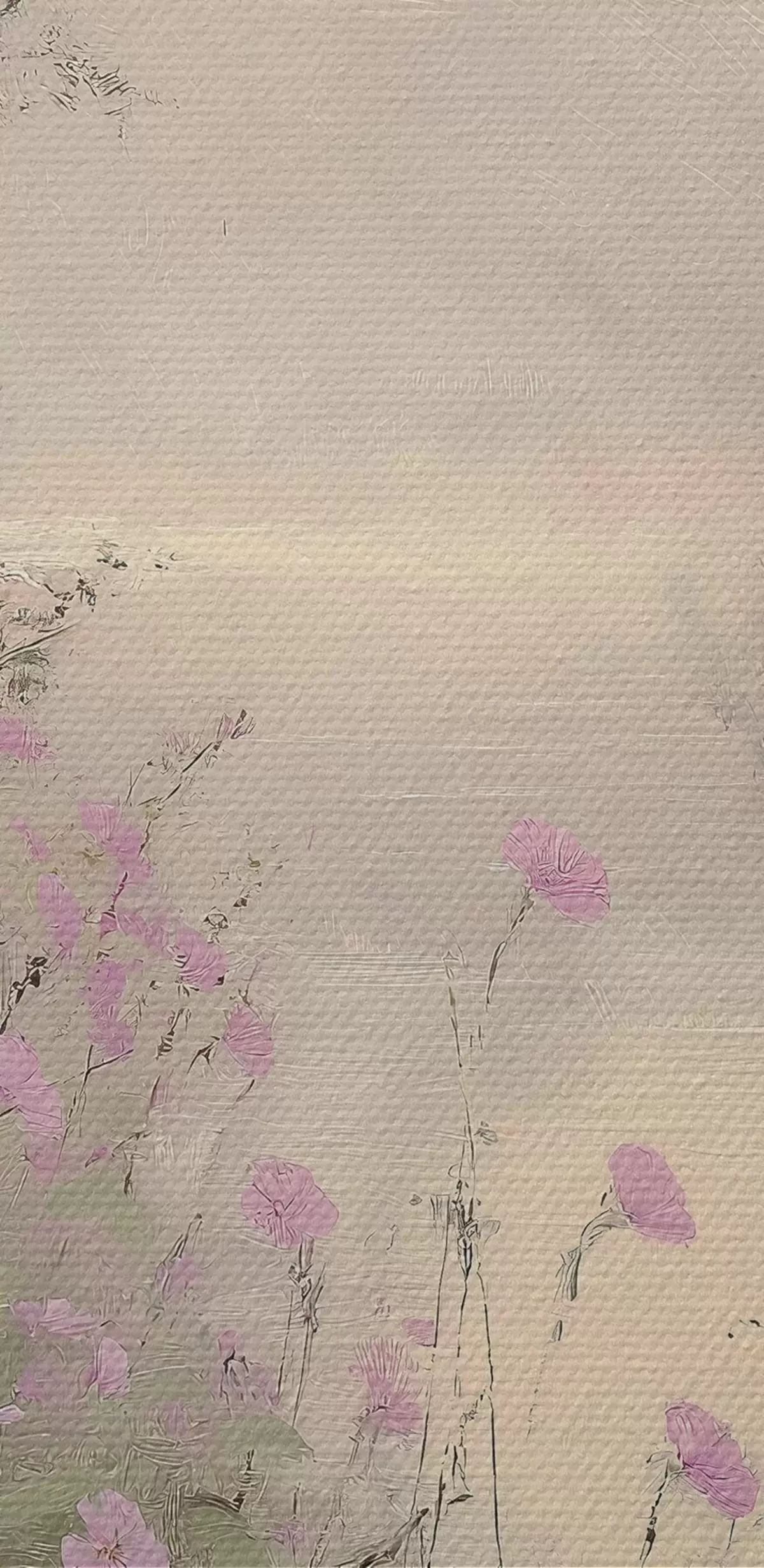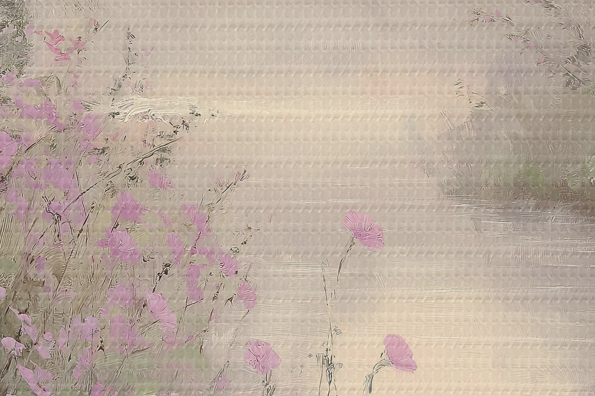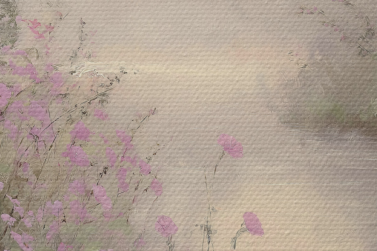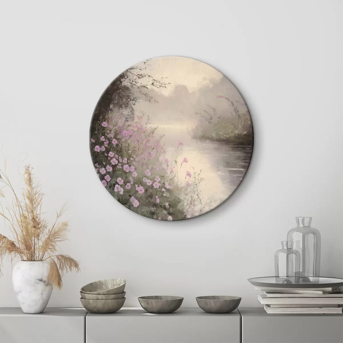 Runde Wandbilder See mit rosa Blumen, Sonnenaufgang, Ölzeichnung, pastellbeige Farben, Nebel r40229