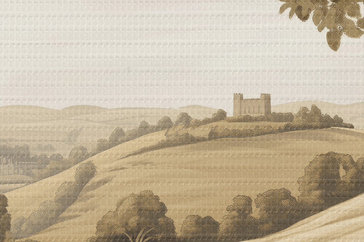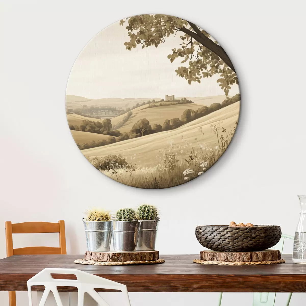 Runde Wandbilder Naturlandschaft in beiger Farbpalette, Wiese, Blumen, Bäume, Schloss r40230