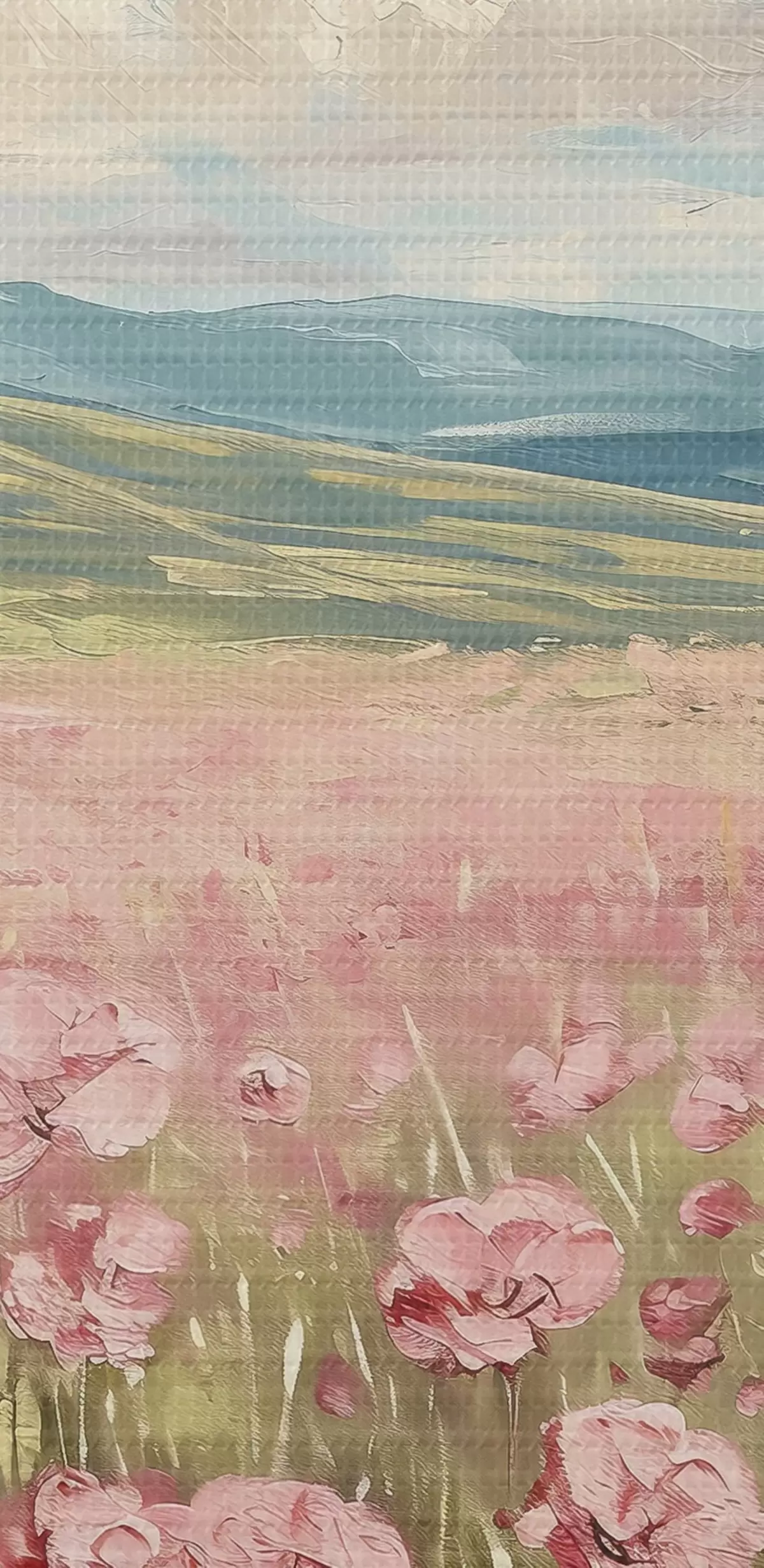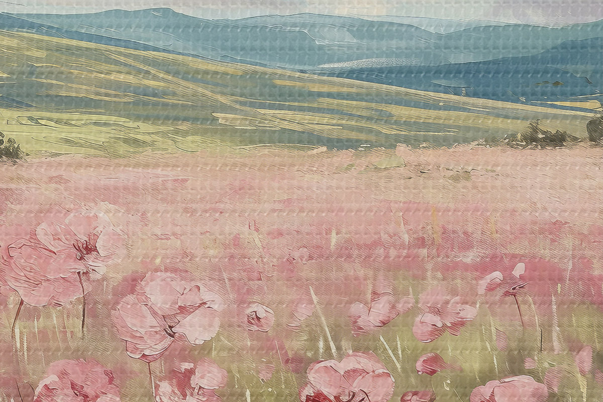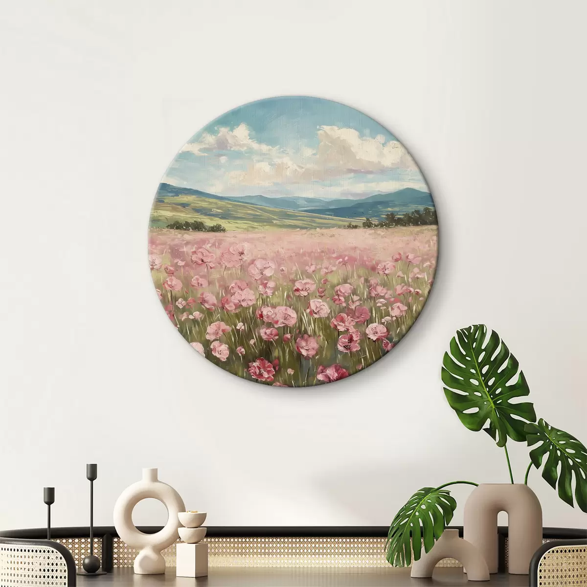 Runde Wandbilder Wiese mit rosa Blumen, Berge, Naturlandschaft, blauer Himmel mit Wolken, Acryl Nr r40232