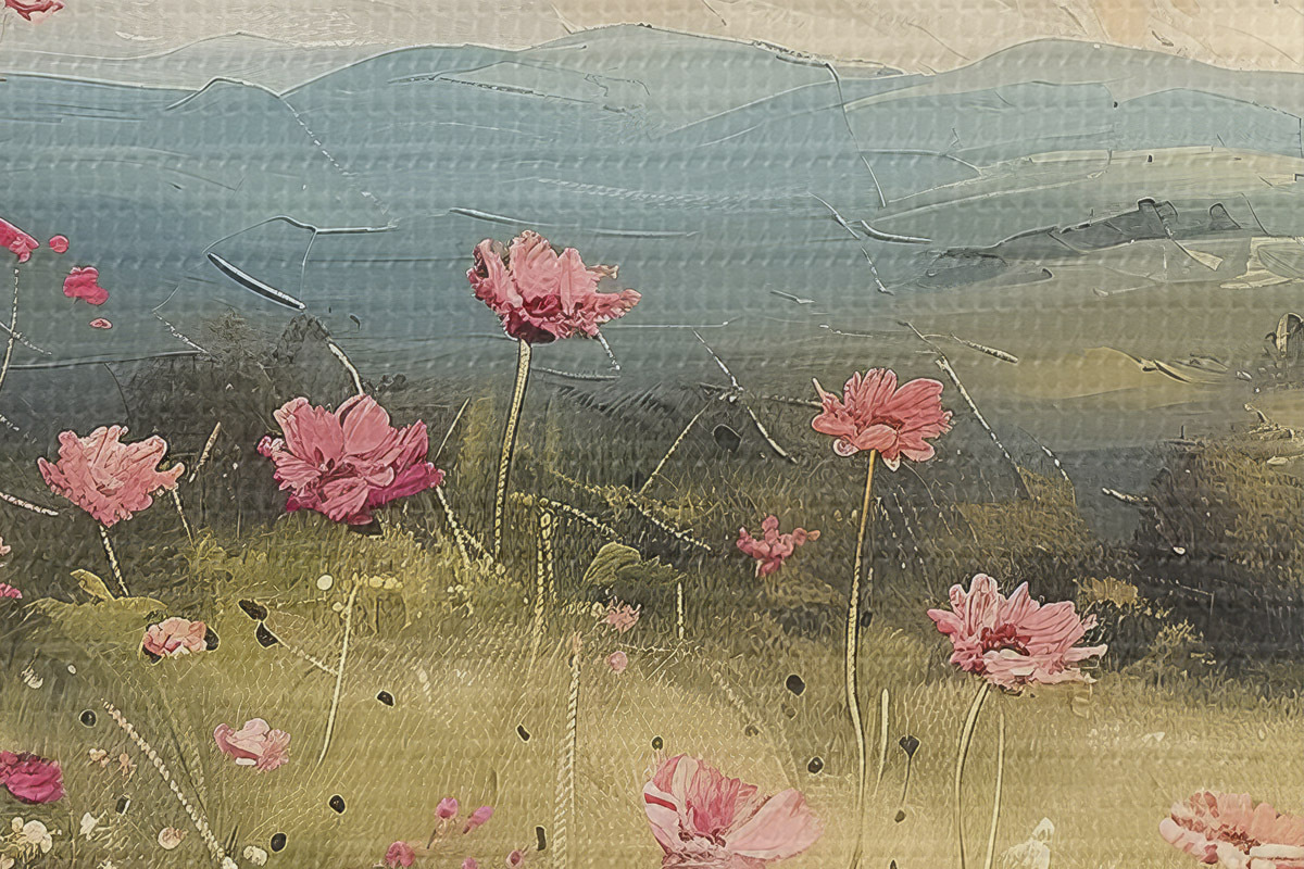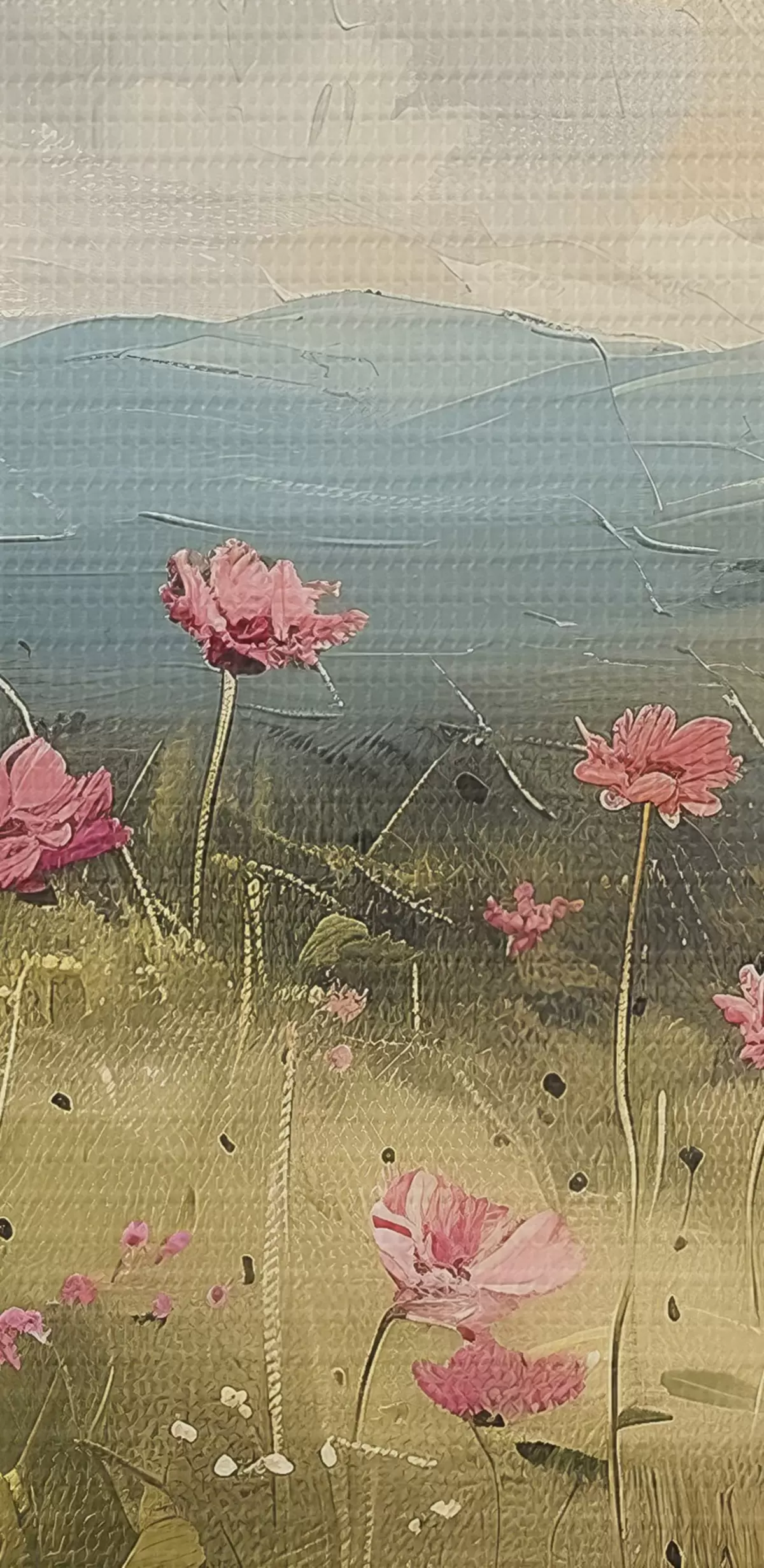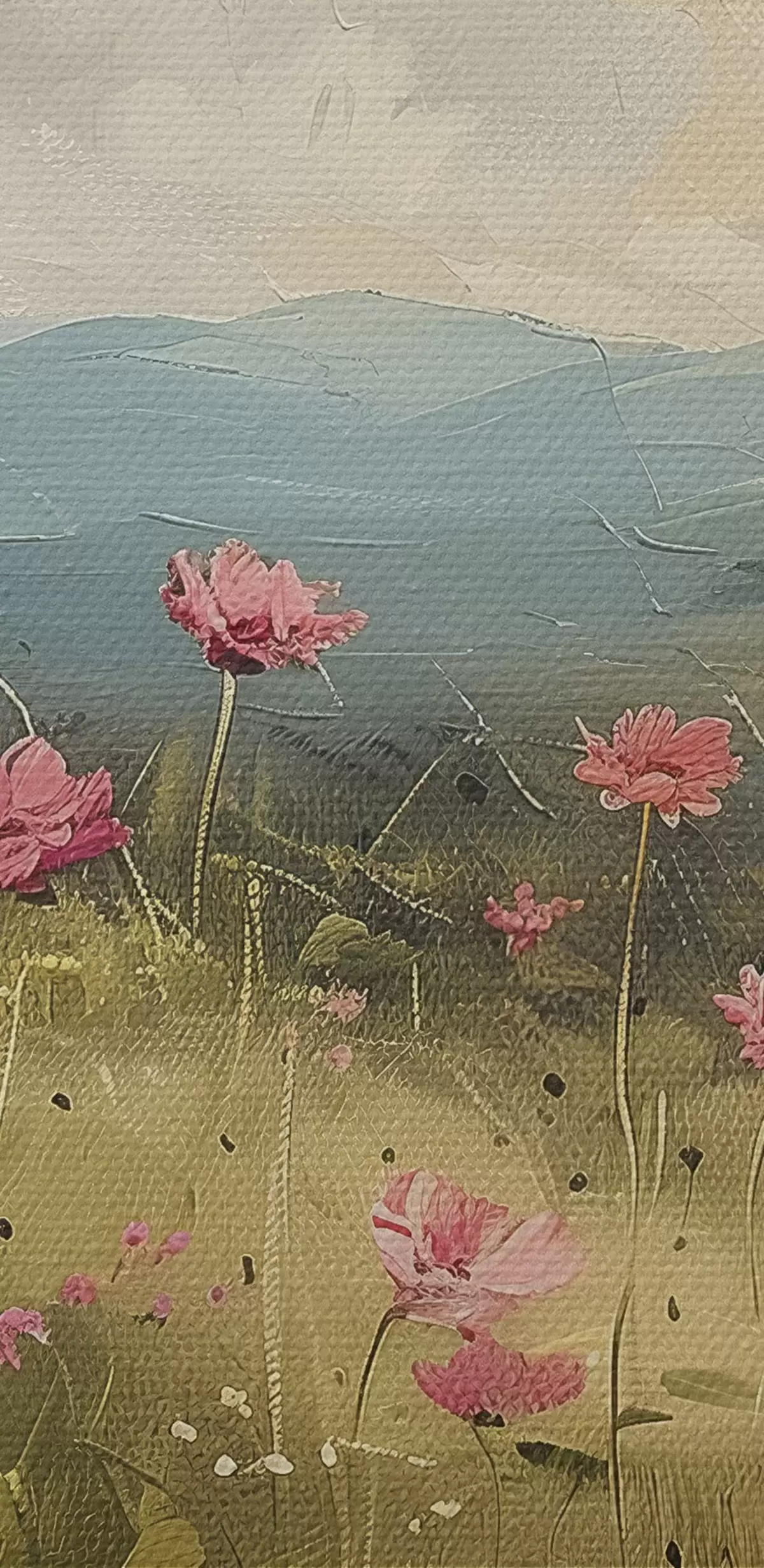 Runde Wandbilder Wiese mit rosa Blumen, grünem Gras, Naturlandschaft, Himmel mit Wolken, Acrylzeichnung r40234