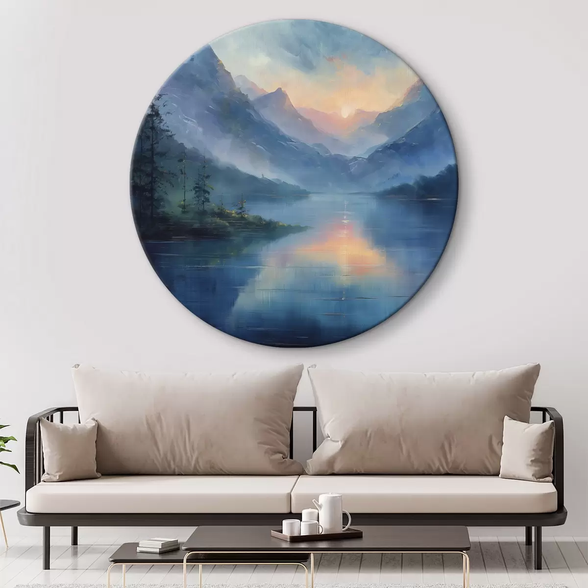 Runde Wandbilder Sonnenuntergang in den Bergen, Nebel, Fluss, Wald, Ölgemälde r40302