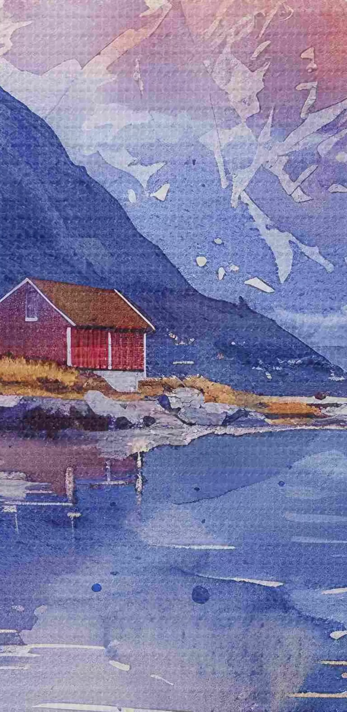 Runde Wandbilder Norwegisches Dorf, Sonnenuntergang Himmel, ruhigen Fluss, Berge, Aquarell r40311