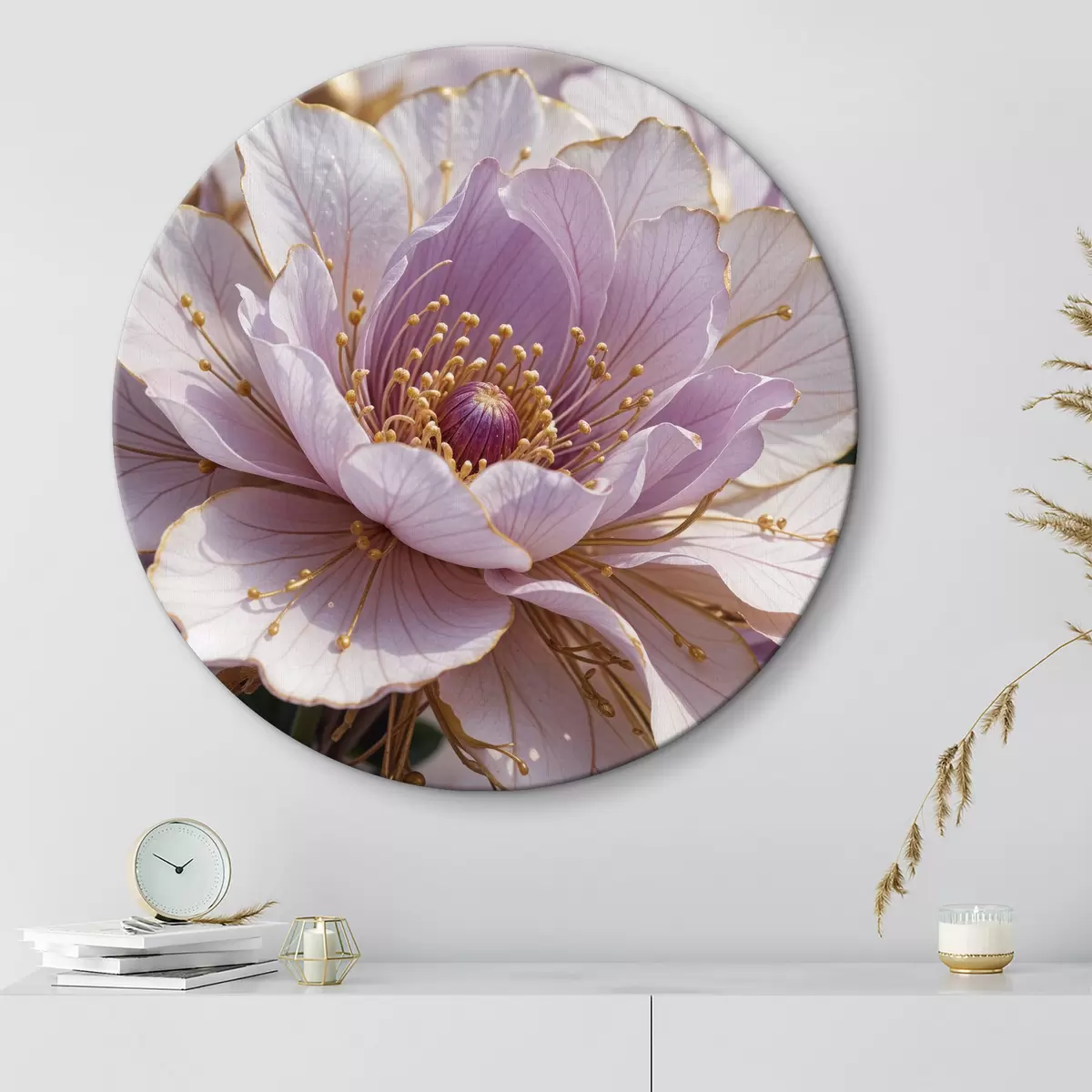 Runde Wandbilder Eine Nahaufnahme einer großen, blassrosa Pfingstrose mit zarten Blütenblättern und einer leuchtend gelben Mitte Nr r40384