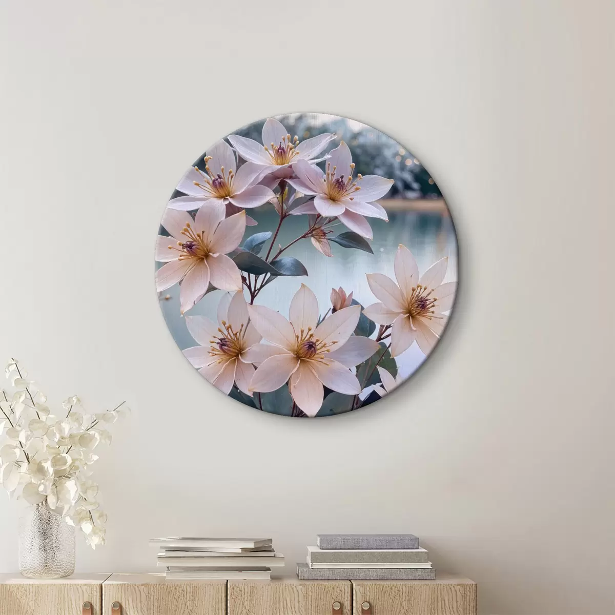Runde Wandbilder Zarte rosa Lotusblüten schwimmen auf ruhigem Wasser, mit einem verschwommenen Hintergrund aus Bäumen und Laub Nr r40388