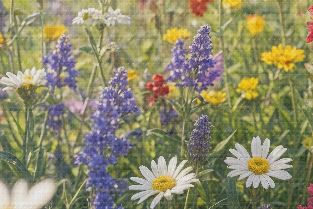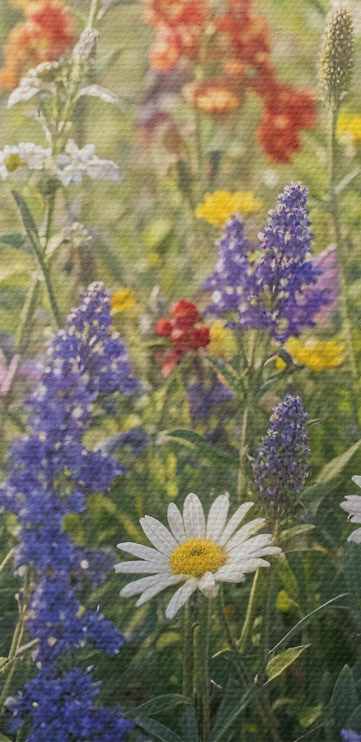 Runde Wandbilder Eine farbenfrohe Wildblumenwiese mit verschiedenen blühenden Blumen, darunter Gänseblümchen, Lavendel und rote Blumen r40390