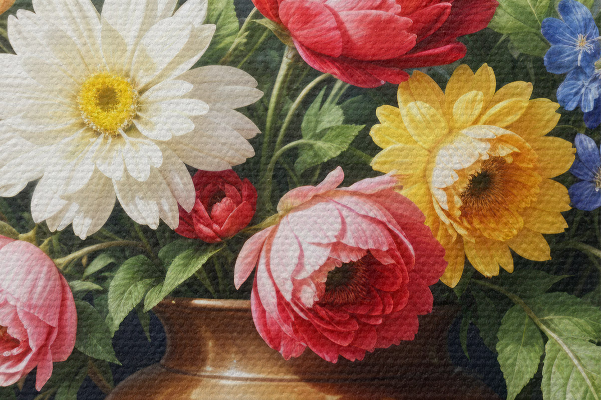 Drei Materialtypen stehen zur Verfügung: Economic Canvas - ein dichtes und haltbares Material für den Digitaldruck, identisch mit Malerleinwand, wasserfeste Oberfläche, realistische Wiedergabe von Details, mittelkörniges Material. Premium Canvas - die Textur ähnelt der einer Malerleinwand (verwobene kleine Fäden). Weiche, detaillierte Wiedergabe des Bildes auf einer matten Oberfläche. Eco-Premium - hochwertiges Gewebe aus 100% Baumwolle. Dank der natürlichen Baumwollfasern ist das Material langlebig und verschleißfest. Hervorragende Farbwiedergabe und Detailtreue.