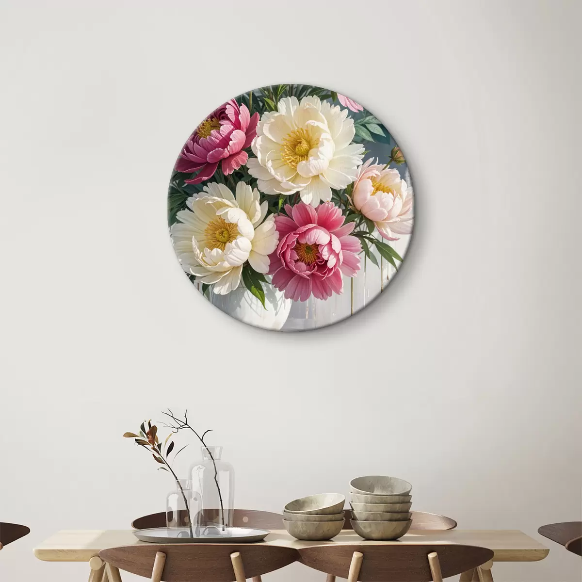 Runde Wandbilder Ein Strauß lebendiger Pfingstrosenblüten in verschiedenen Rosa-, Weiß- und Gelbtönen mit Farbspritzern Nr r40403