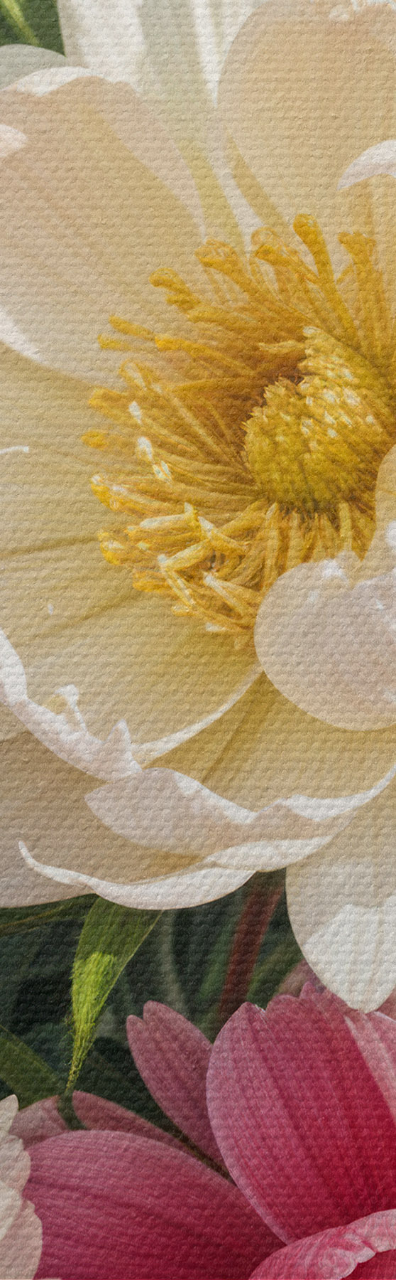 Drei Materialtypen stehen zur Verfügung: Economic Canvas - ein dichtes und haltbares Material für den Digitaldruck, identisch mit Malerleinwand, wasserfeste Oberfläche, realistische Wiedergabe von Details, mittelkörniges Material. Premium Canvas - die Textur ähnelt der einer Malerleinwand (verwobene kleine Fäden). Weiche, detaillierte Wiedergabe des Bildes auf einer matten Oberfläche. Eco-Premium - hochwertiges Gewebe aus 100% Baumwolle. Dank der natürlichen Baumwollfasern ist das Material langlebig und verschleißfest. Hervorragende Farbwiedergabe und Detailtreue.