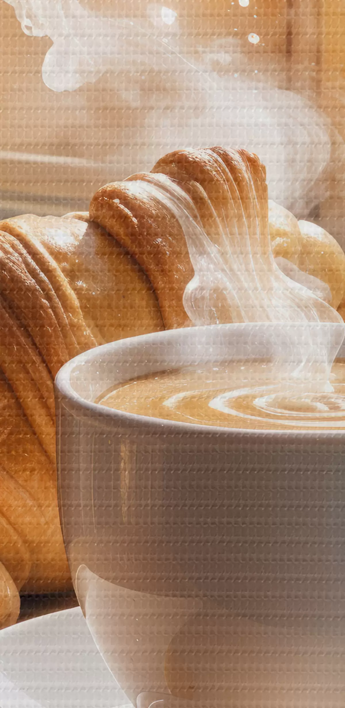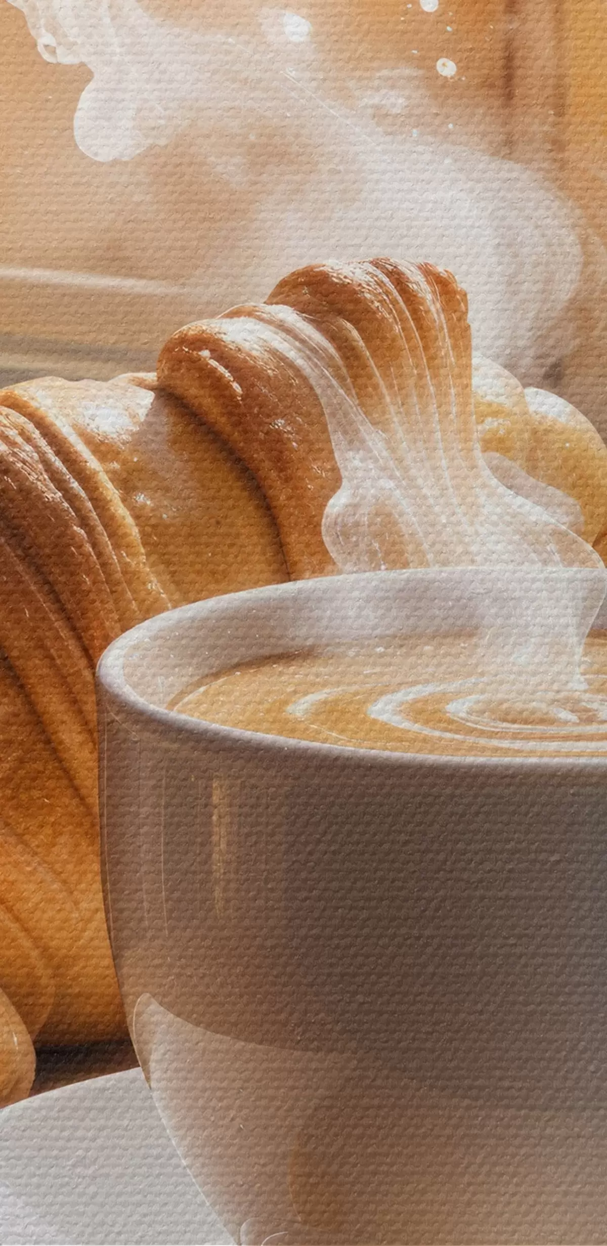 Runde Wandbilder Eine warme Tasse Kaffee mit aufsteigendem Dampf, auf einem Tisch neben einem Croissant platziert, mit Blick auf ein historisches Gebäude r40405