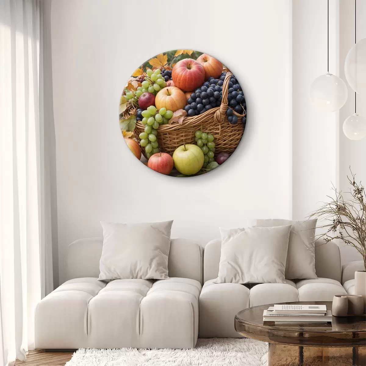 Runde Wandbilder Ein Korb mit verschiedenen Herbstfrüchten, darunter Äpfel, Trauben und Birnen, umgeben von abgefallenen Blättern r40409