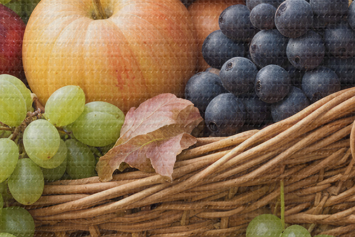 Runde Wandbilder Ein Korb mit verschiedenen Herbstfrüchten, darunter Äpfel, Trauben und Birnen, umgeben von abgefallenen Blättern Nr r40409