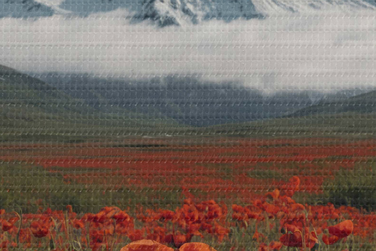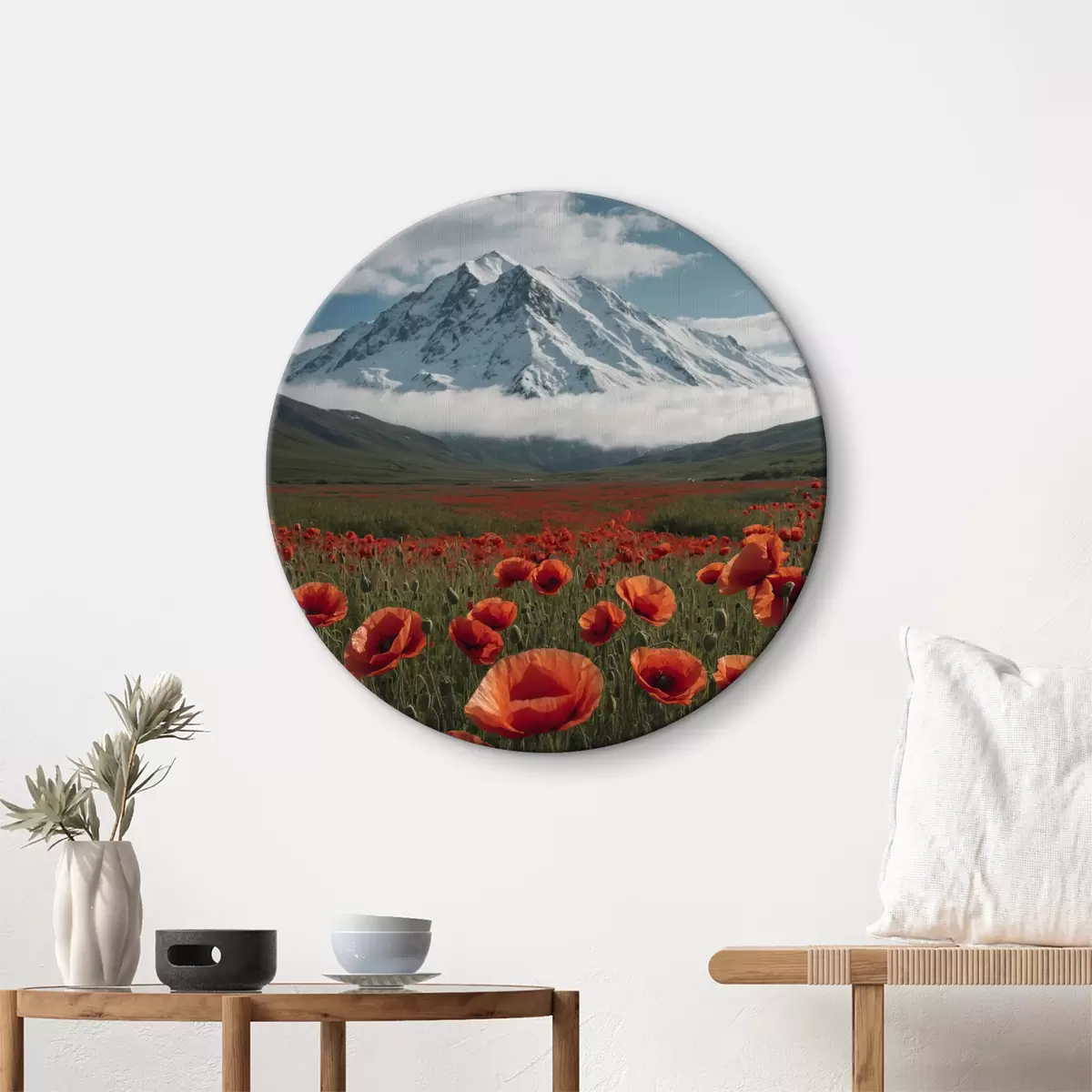 Runde Wandbilder Ein Mohnblumenfeld vor dem Hintergrund der schneebedeckten Berge Nr r40469