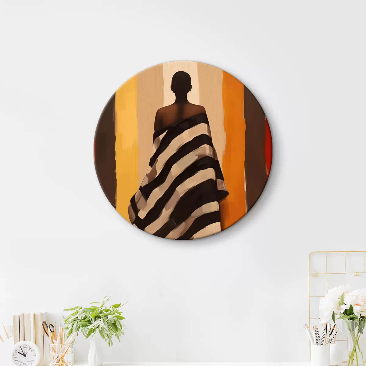 Runde Wandbilder Silhouette einer Afroamerikanerin in einem gestreiften Umhang auf einem Hintergrund mit vertikalen Streifen, schwarz, beige, gelb, rot, braun Nr r40487