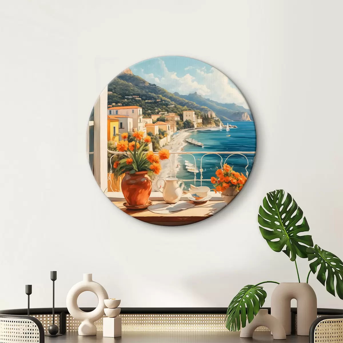 Runde Wandbilder Blick vom Balkon auf die Meereslagune mit Bergen im Hintergrund, bunte Blumen in einem Topf Nr r40492