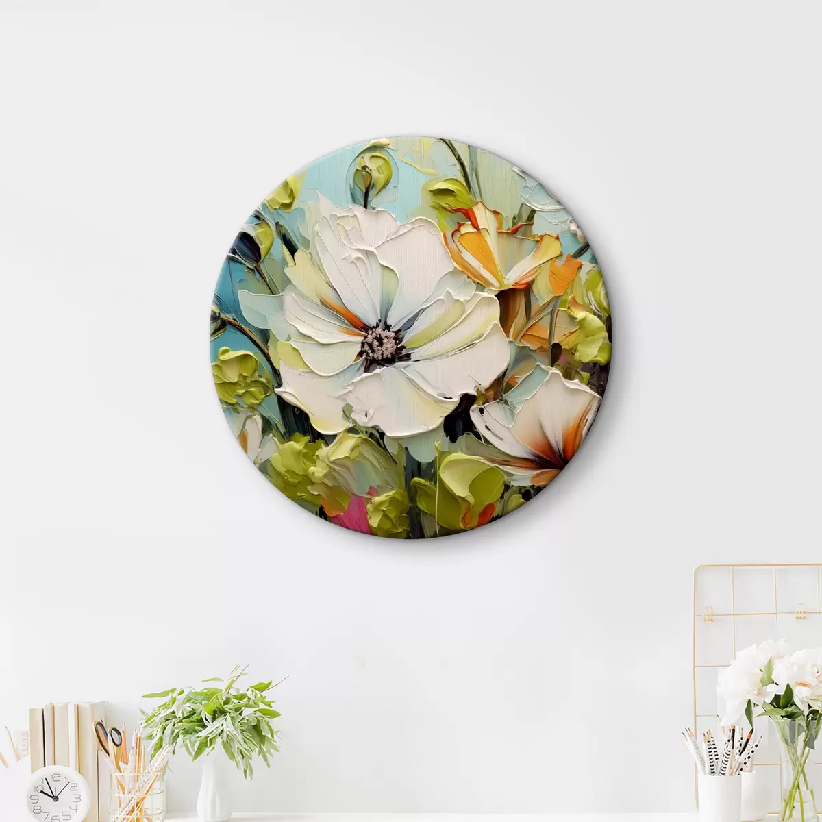 Runde Wandbilder Blumenstrauß aus weißen Blumen im Laub, Nachahmung von Pinselstrichen, grün, blau, weiß Nr r40496