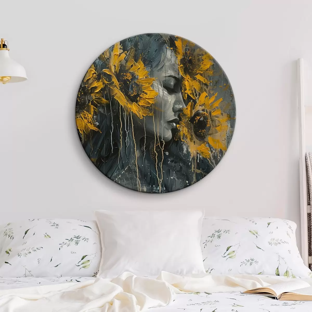 Runde Wandbilder Das Gesicht eines Mädchens mit verschwommenen Sonnenblumen Nr r40502