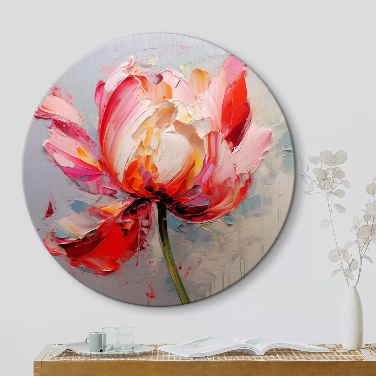 Runde Wandbilder Blühende Tulpe, rot, rosa, graue Farbe Nr r40519