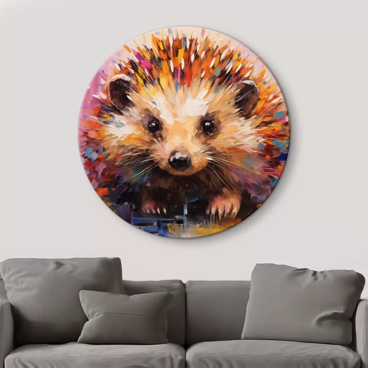 Runde Wandbilder Porträt eines Igels in leuchtenden Farben: gelb, lila, blau, orange, braun r40532