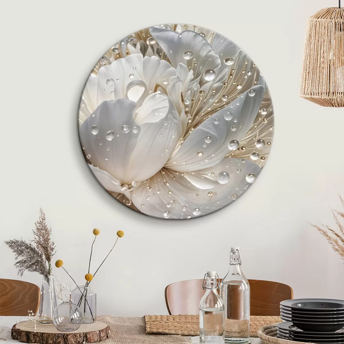 Runde Wandbilder Nahaufnahme einer weißen Pfingstrose mit Wassertropfen auf den Blütenblättern, vor einem unscharfen Hintergrund Nr r40539