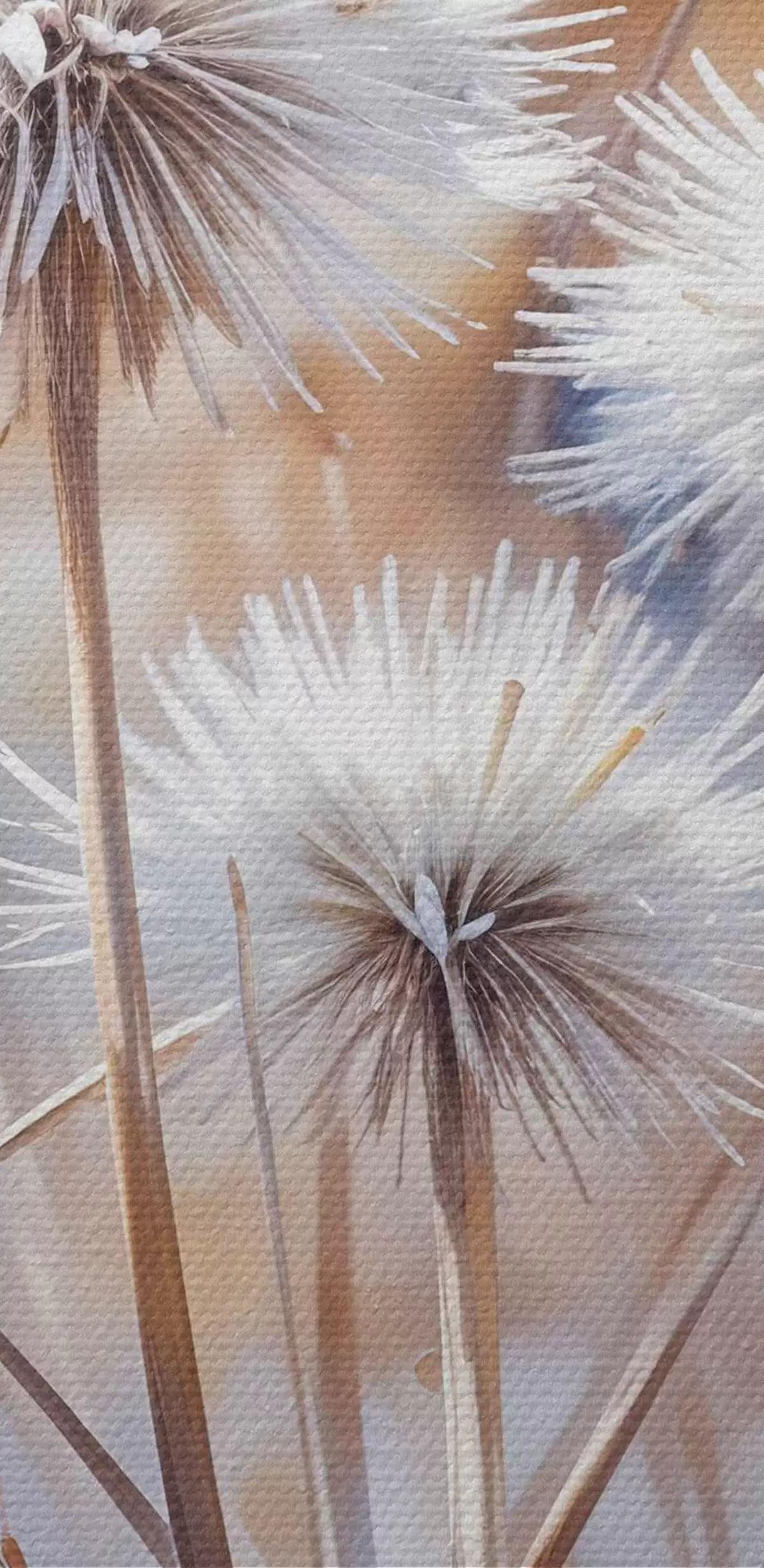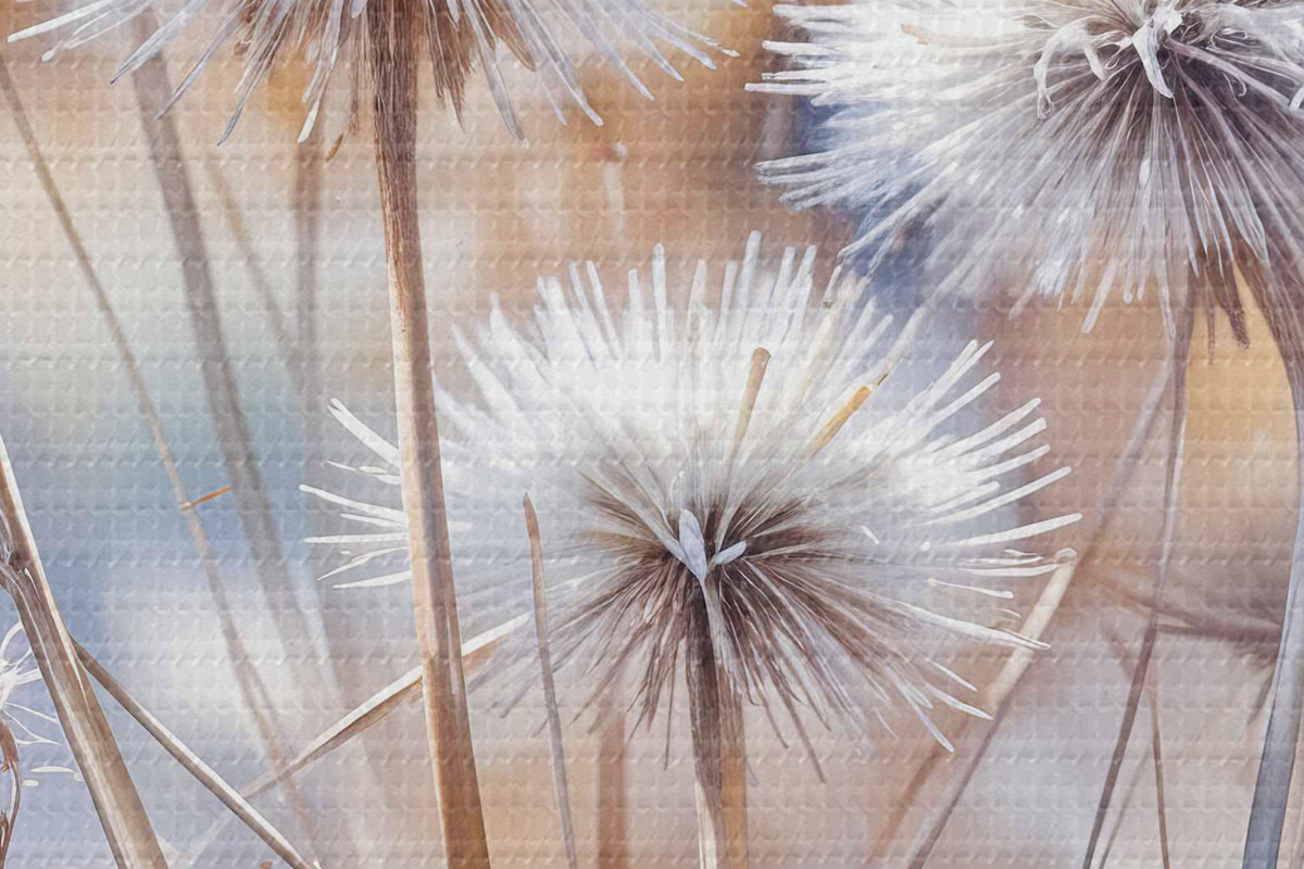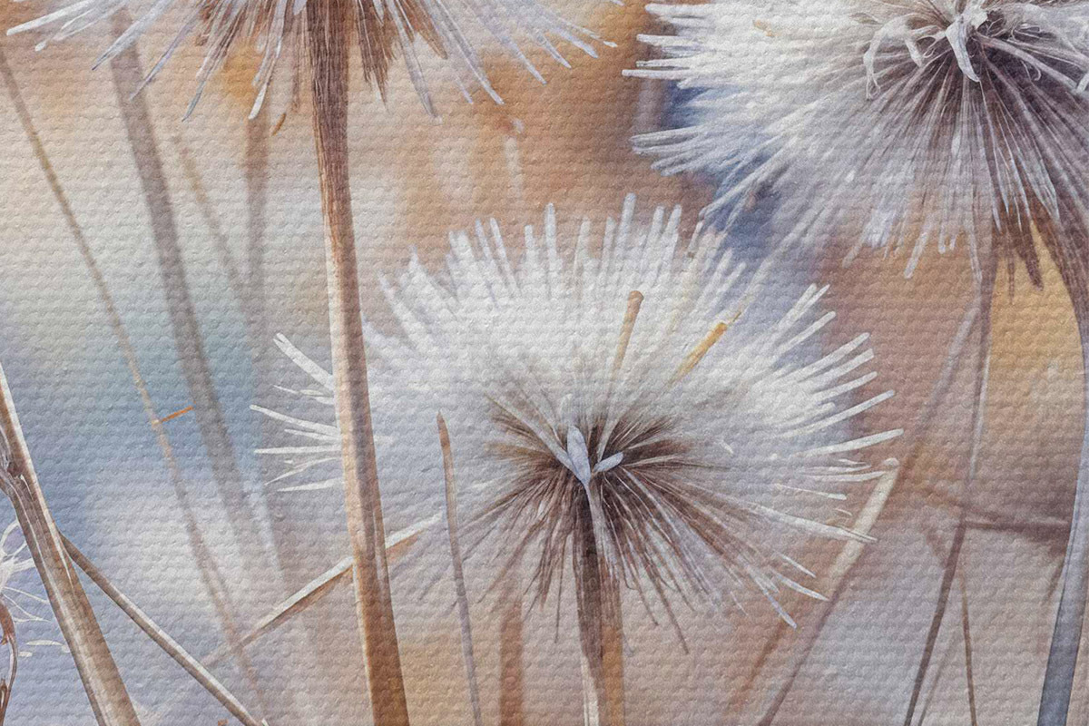 Runde Wandbilder Fluffy weißen Löwenzahn Blumen auf einem verschwommenen Aquarell Hintergrund mit warmer Beleuchtung r40541
