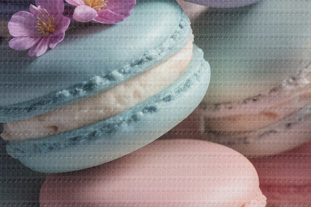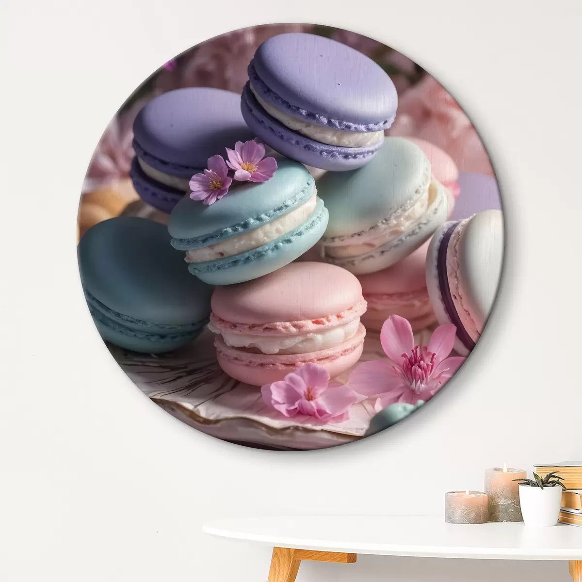 Runde Wandbilder Bunte Makronen mit rosa und lila Blumen auf einem Teller, Nahaufnahme r40546
