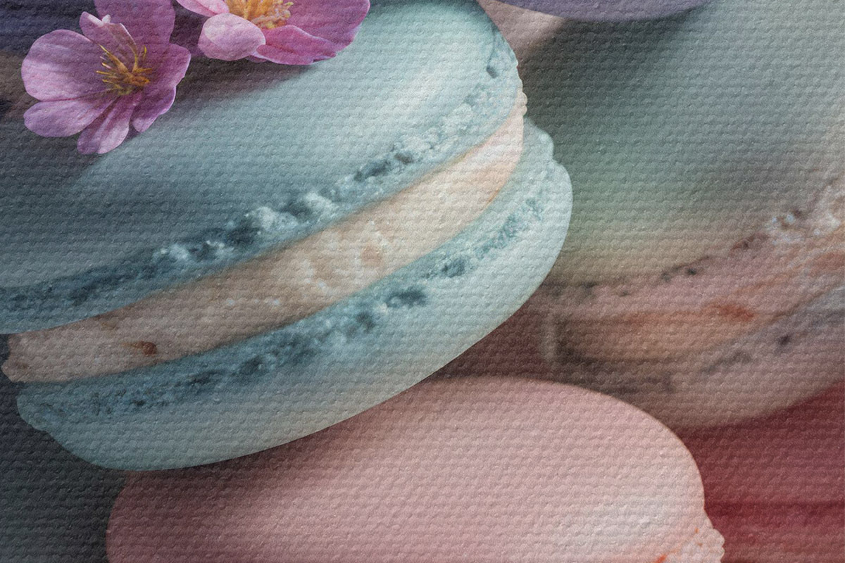 Runde Wandbilder Bunte Makronen mit rosa und lila Blumen auf einem Teller, Nahaufnahme Nr r40546