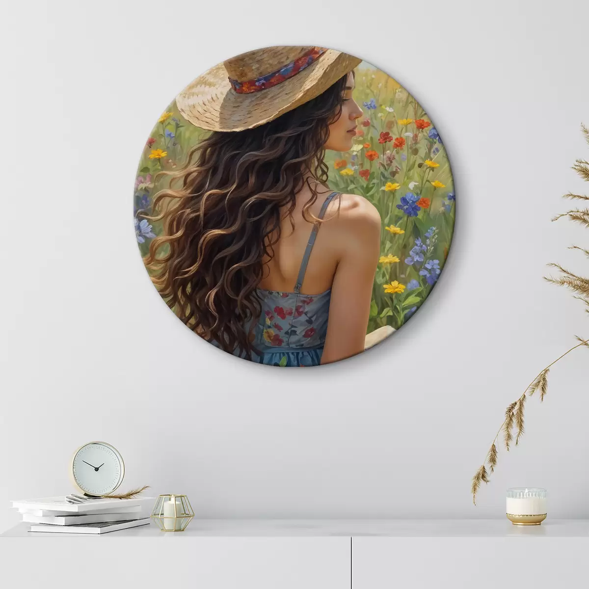 Runde Wandbilder Junge Frau mit lockigem Haar, die einen Strohhut und ein Blumenkleid trägt, steht in einem Wildblumenfeld Nr r40560