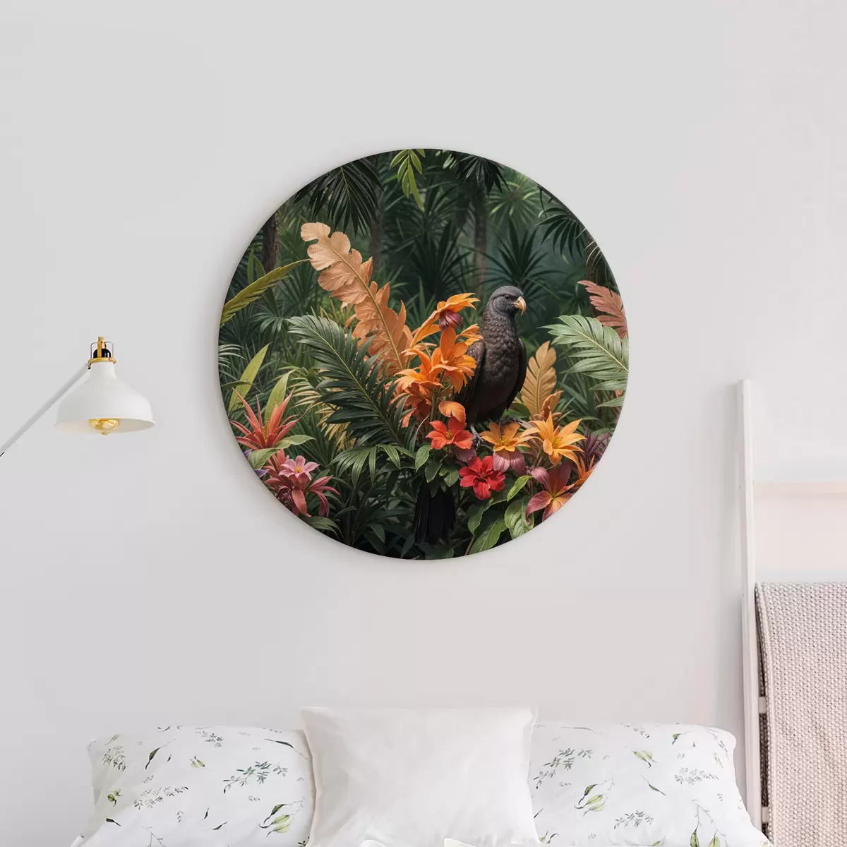 Runde Wandbilder Tropischer Vogel, der auf einem Zweig sitzt, umgeben von üppiger Vegetation, Palmenblättern, Blumen und exotischen Pflanzen Nr r40578