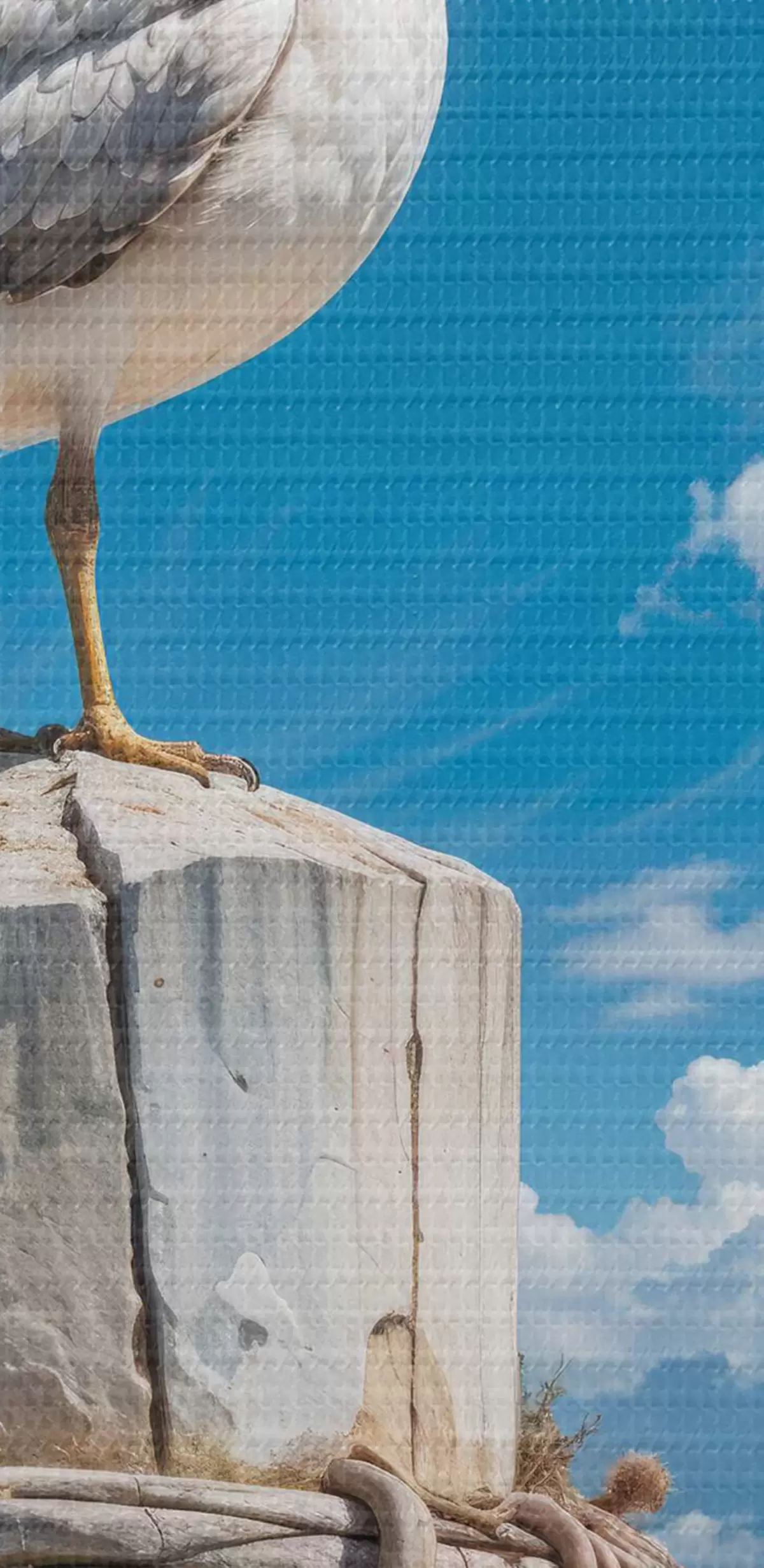 Runde Wandbilder Eine weiße Möwe sitzt auf einem Holzpfahl vor dem Hintergrund eines hellblauen Himmels und des Ozeans mit Wellen Nr r40590