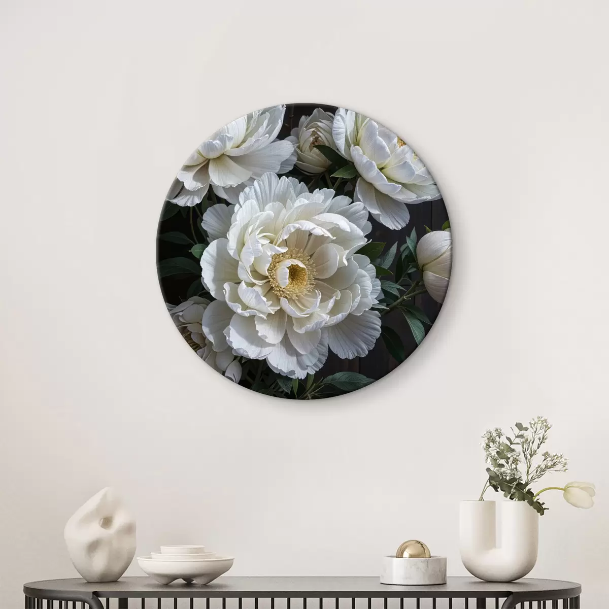 Runde Wandbilder Weiße Pfingstrose Blumen mit gelben Zentren blühen im Garten auf einem dunklen Hintergrund Nr r40600