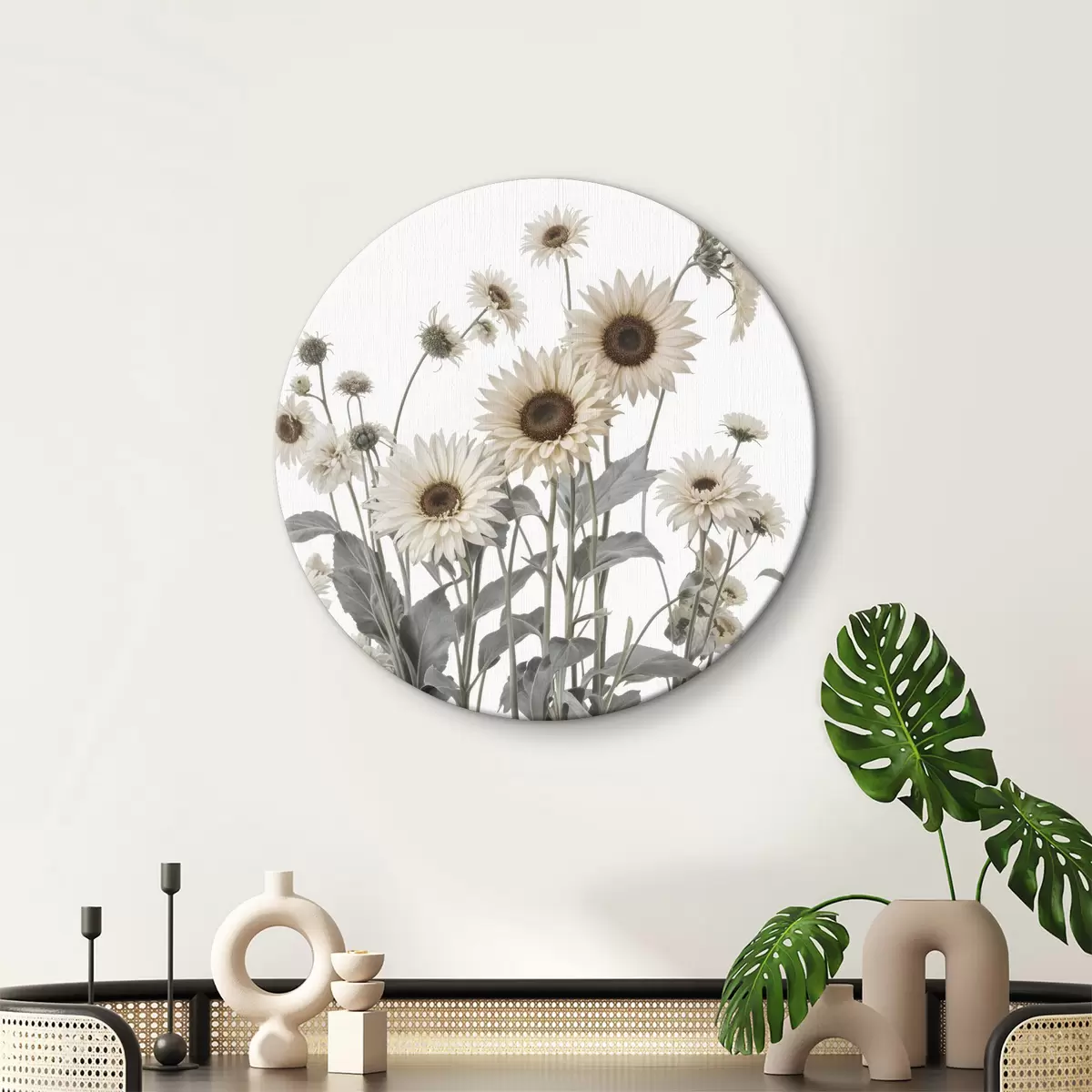 Runde Wandbilder Ein Feld mit weißen Gänseblümchen auf weißem Hintergrund, mit Sonnenblumen im Hintergrund r40602