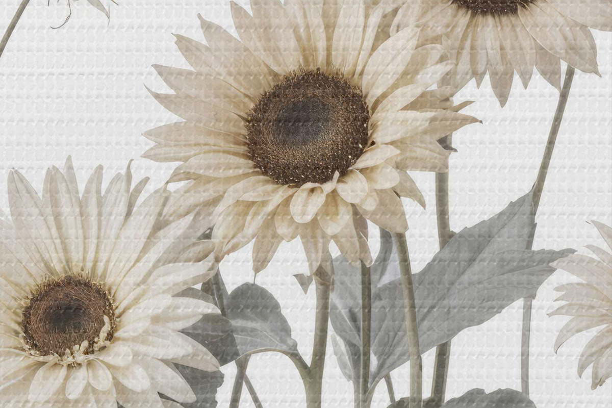 Runde Wandbilder Ein Feld mit weißen Gänseblümchen auf weißem Hintergrund, mit Sonnenblumen im Hintergrund Nr r40602