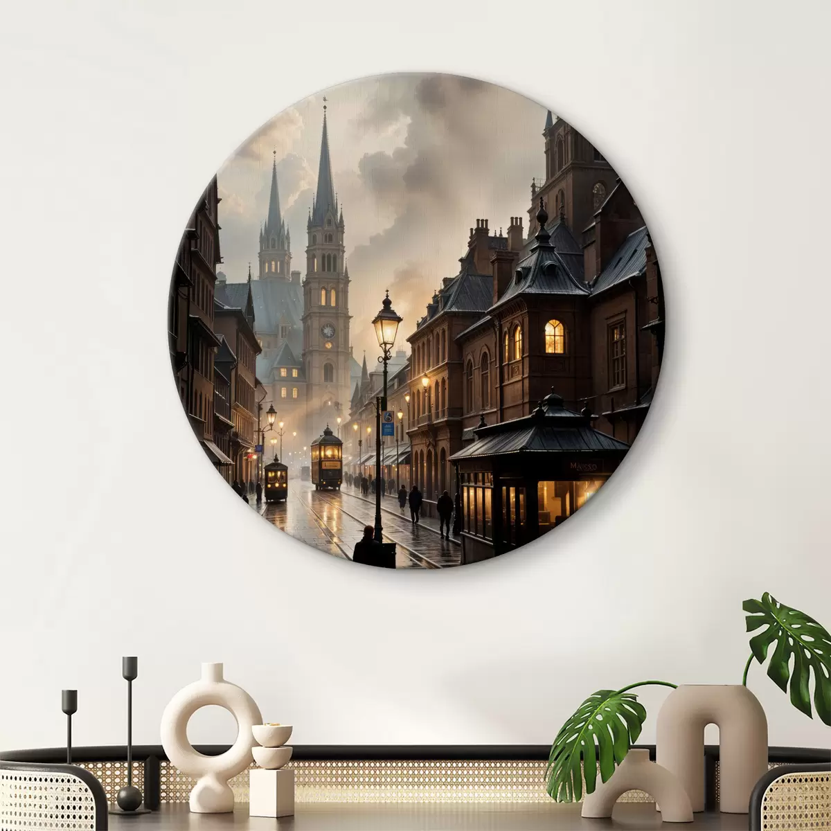 Runde Wandbilder Ein regnerischer Abend in einer alten europäischen Stadt, mit Kopfsteinpflaster, historischen Gebäuden und einer vorbeifahrenden Straßenbahn Nr r40604