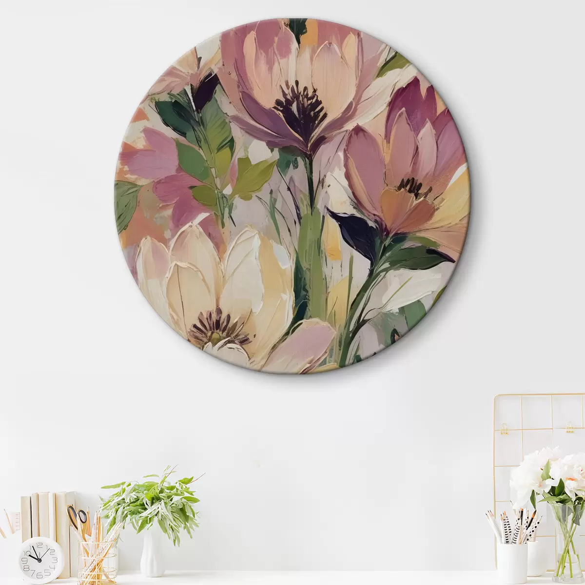 Runde Wandbilder Ein lebhaftes Blumenarrangement mit großen, farbenfrohen Blumen in Rosa-, Pfirsich- und Gelbtönen Nr r40609