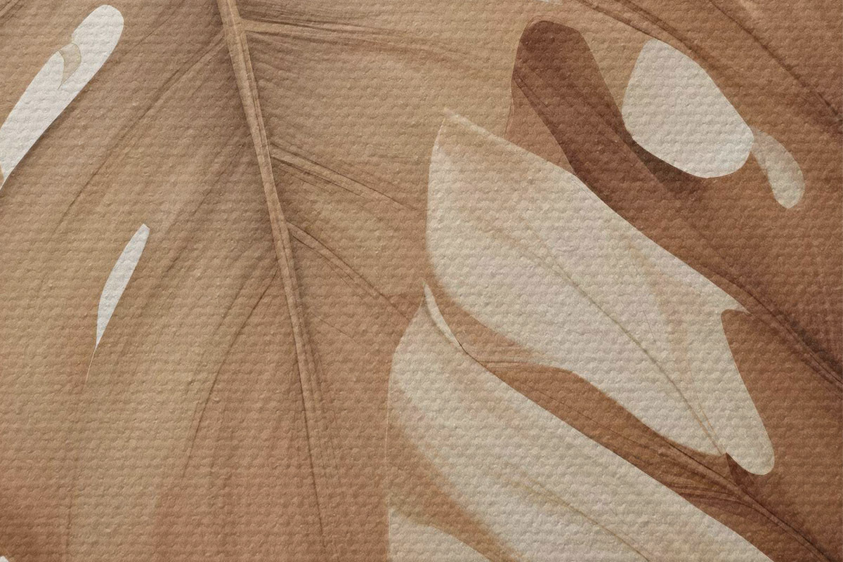 Runde Wandbilder Ein Druck von tropischen Blättern mit natürlicher, organischer Textur in Braun- und Beigetönen r40613