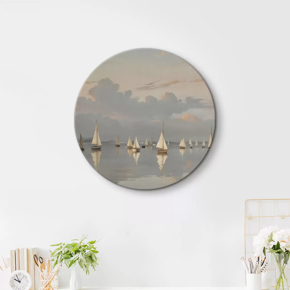 Runde Wandbilder Eine Flotte weißer Segelboote auf einem ruhigen, spiegelnden Gewässer bei Sonnenuntergang, mit einem bewölkten Himmel im Hintergrund r40615
