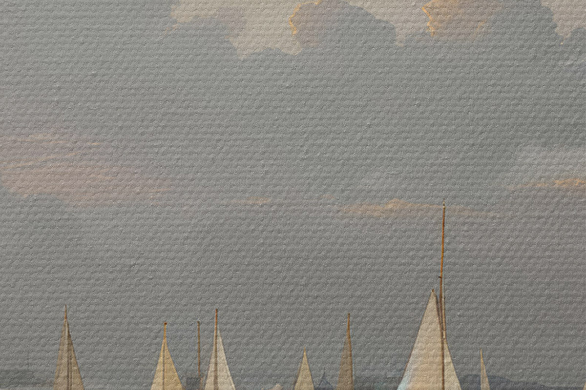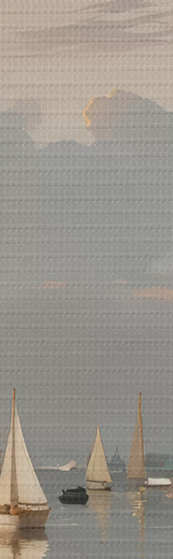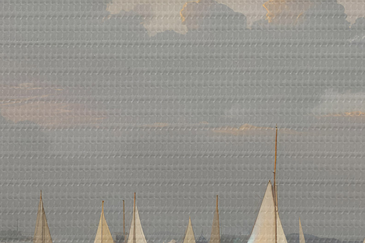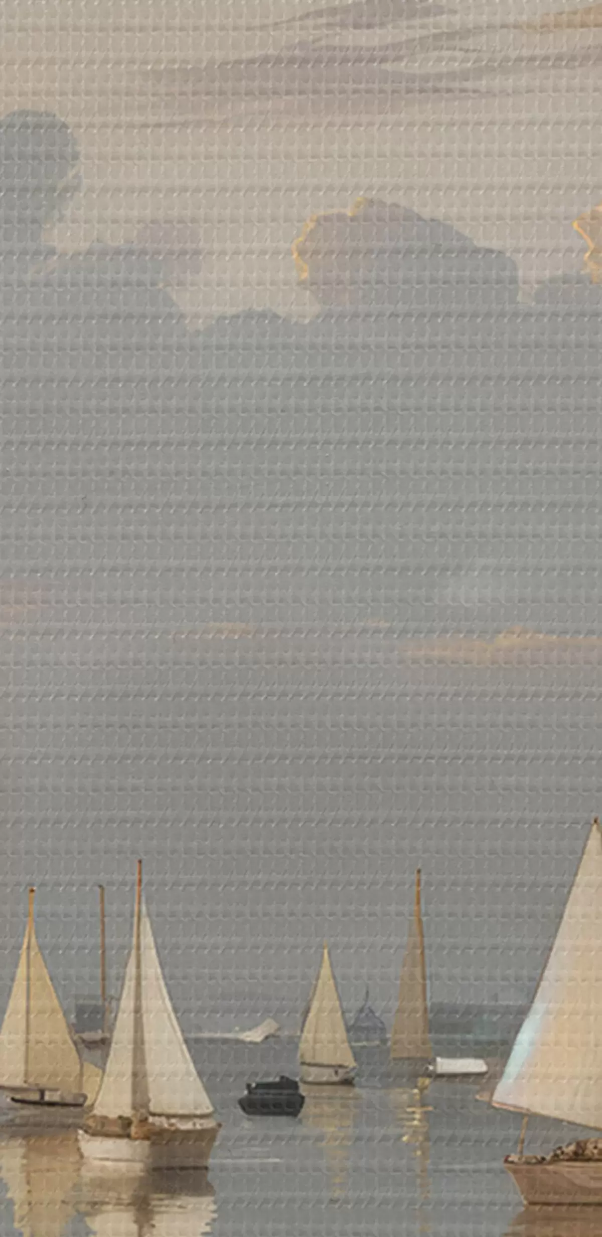 Runde Wandbilder Eine Flotte weißer Segelboote auf einem ruhigen, spiegelnden Gewässer bei Sonnenuntergang, mit einem bewölkten Himmel im Hintergrund Nr r40615